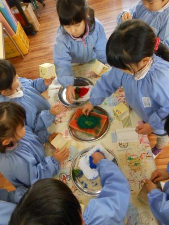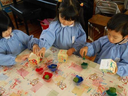 豆まき用のますづくりの技法は、年少組さんは、“オクラスタンプ”、年中組さんは “野菜スタンプ”、年長組さんは “マジックを使って自分で模様をかく”・・・と、年次によって違い、素敵な模様のますができています!!