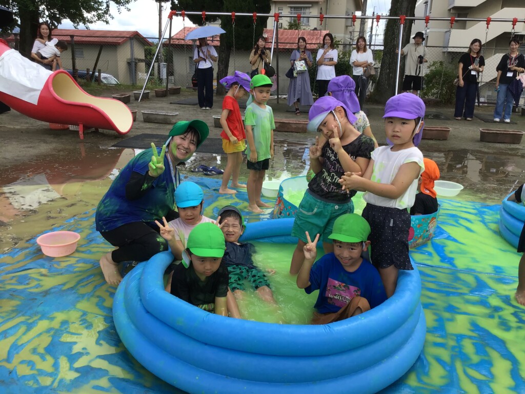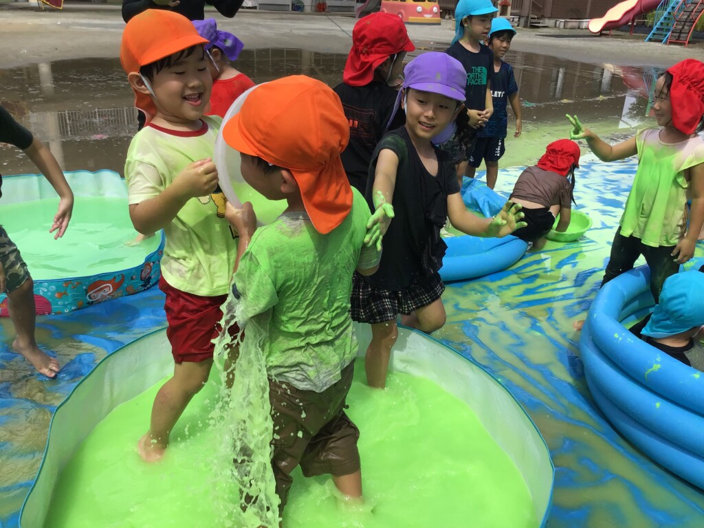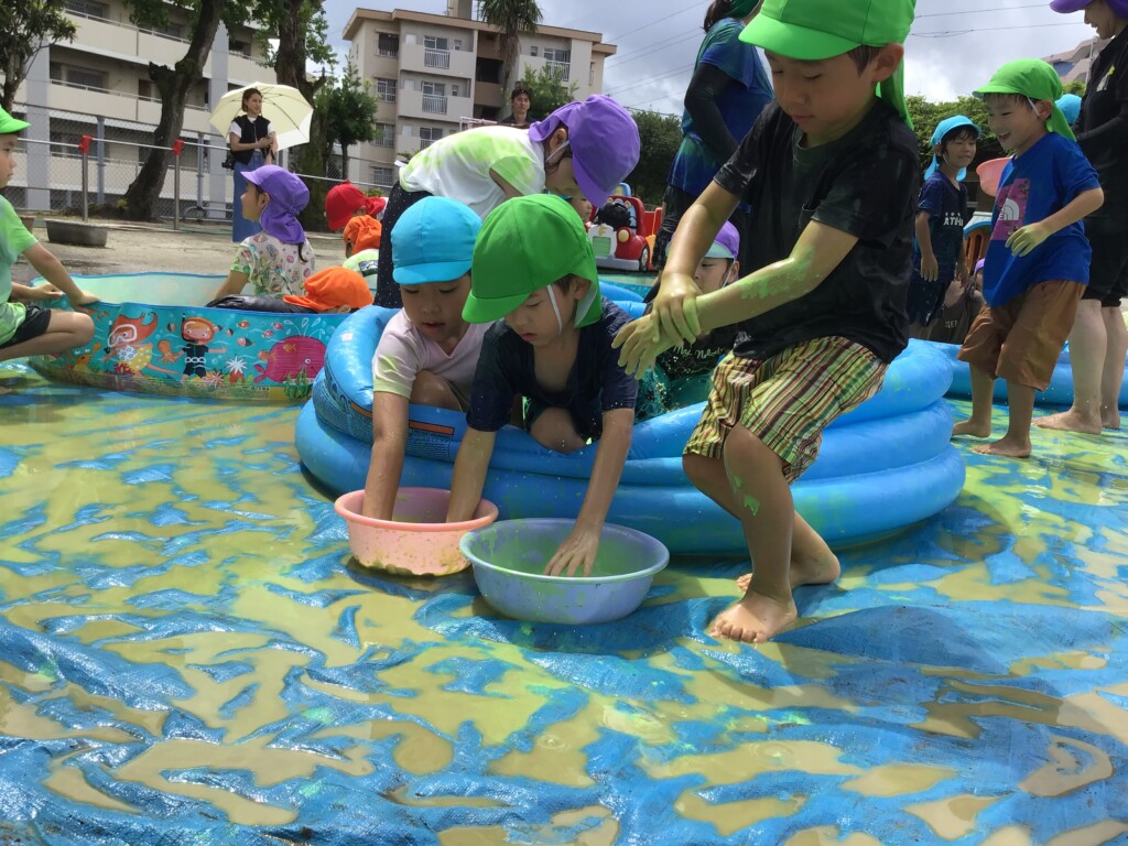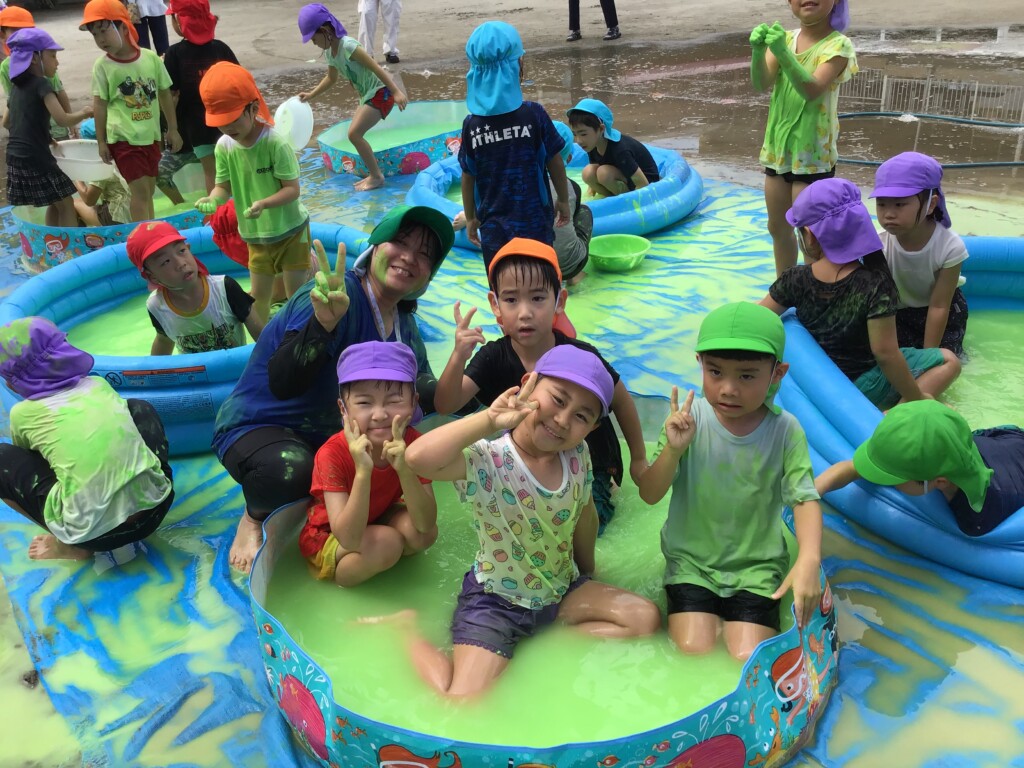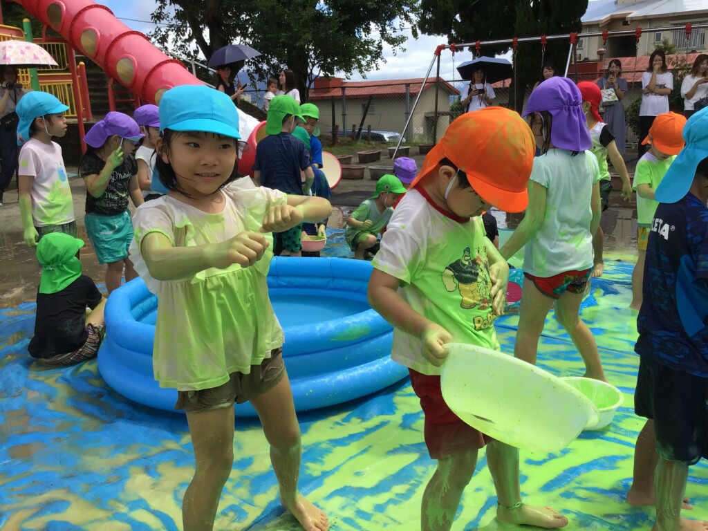 9月17日(水)に園庭水遊びとボディペインティングをしました。朝から雨模様で判断に迷いましたが、参観の保護者がいらっしゃるとお日様も顔を出しました。水を掛け合ったり、温泉みたいにゆっくり浸かったり、水遊びを楽しんだ後は、いよいよボディペインティング☆「手が緑になった!」「カエルみたい。」「みんなでゾンビになろう。」と大騒ぎ!大いに盛り上がったボディペインティングでした。