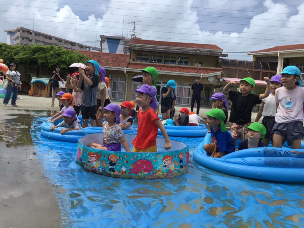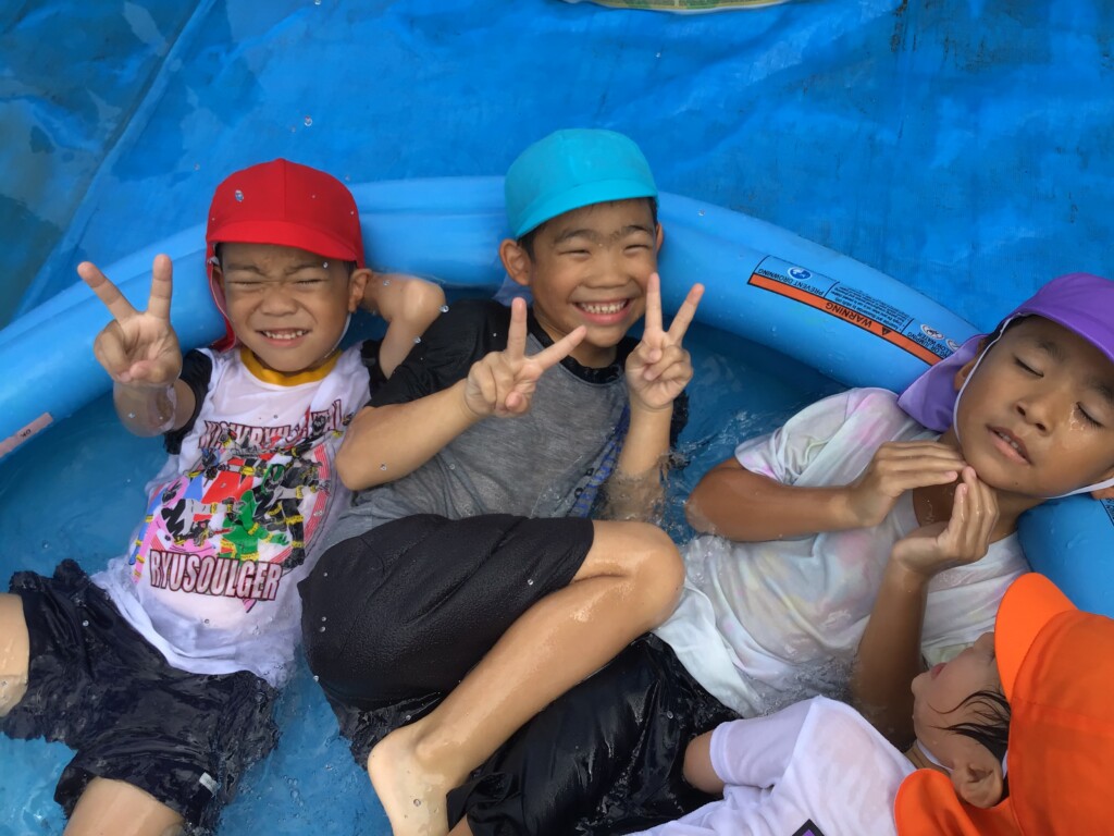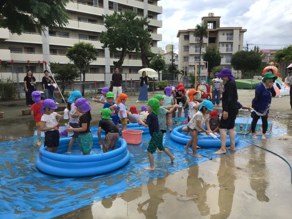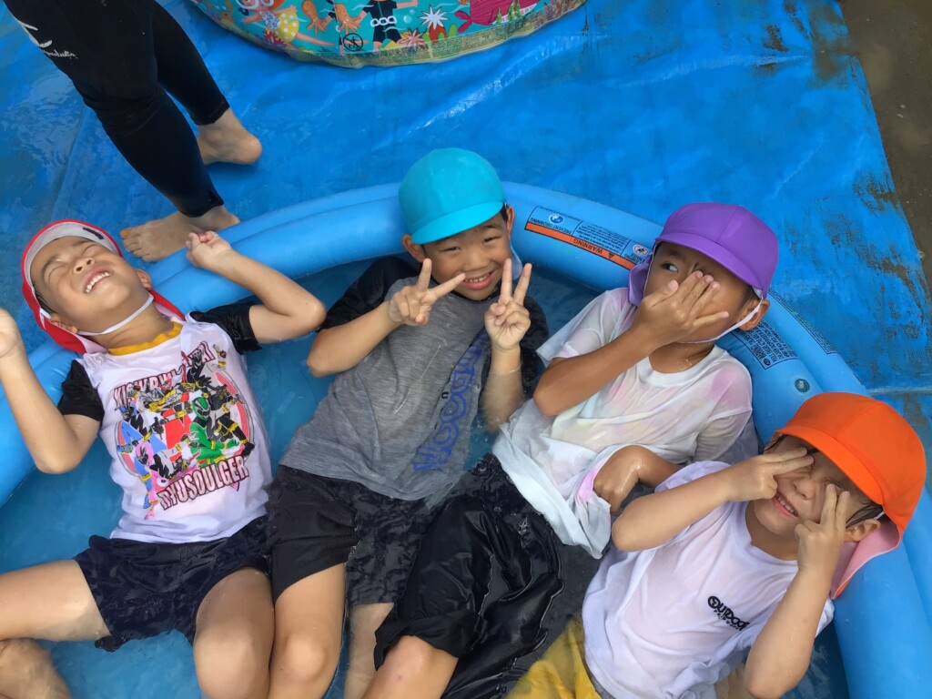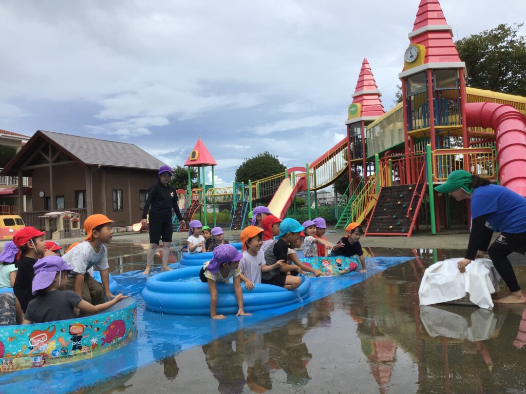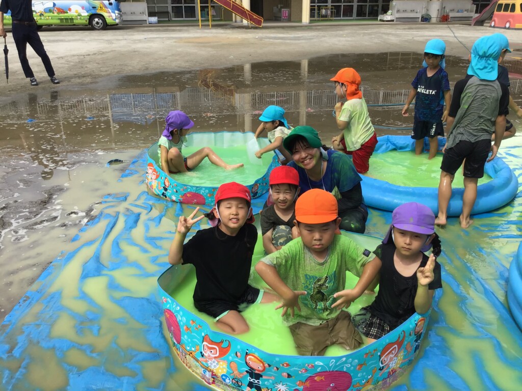 9月17日(水)に園庭水遊びとボディペインティングをしました。朝から雨模様で判断に迷いましたが、参観の保護者がいらっしゃるとお日様も顔を出しました。水を掛け合ったり、温泉みたいにゆっくり浸かったり、水遊びを楽しんだ後は、いよいよボディペインティング☆「手が緑になった!」「カエルみたい。」「みんなでゾンビになろう。」と大騒ぎ!大いに盛り上がったボディペインティングでした。