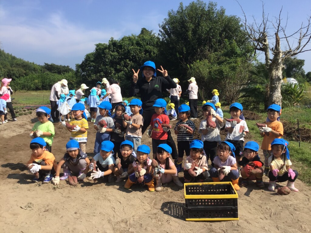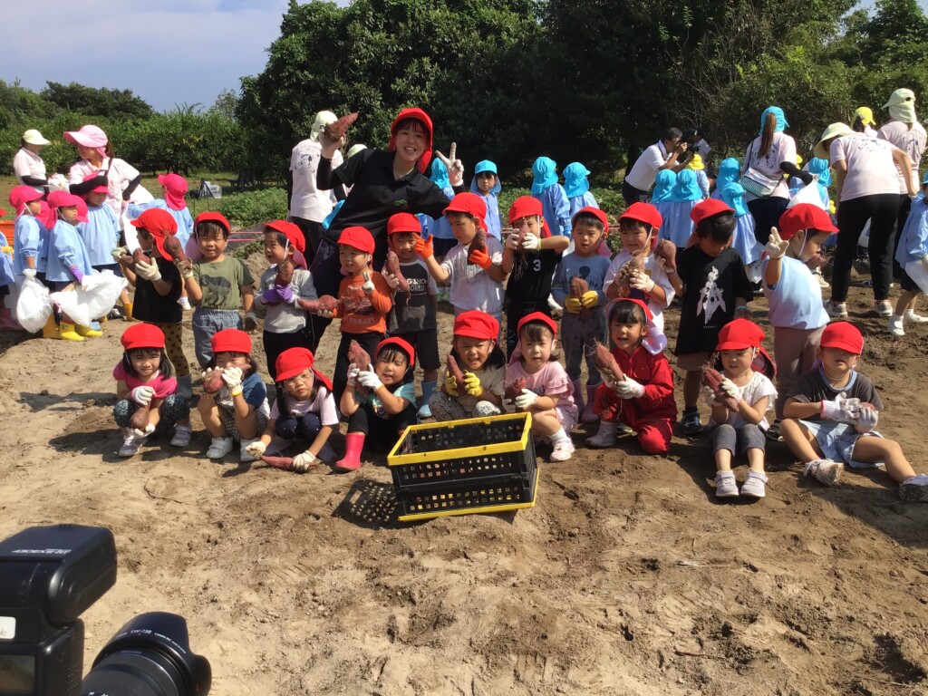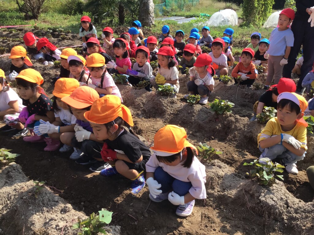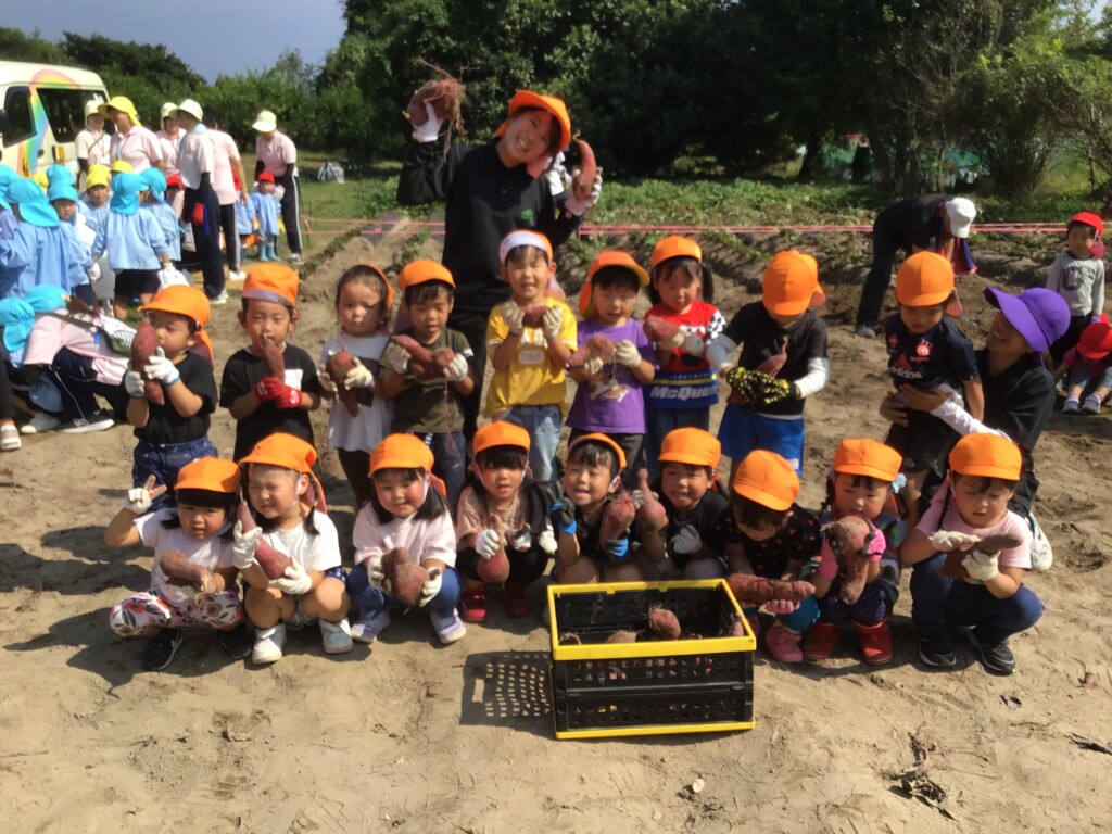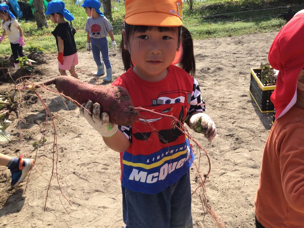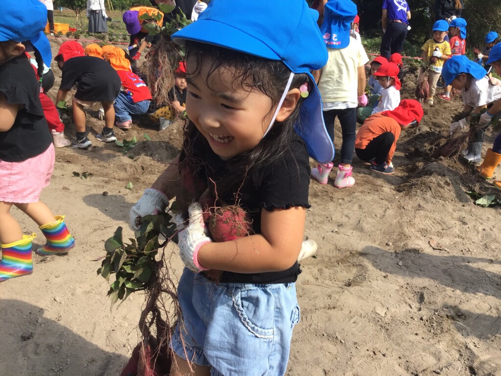 10月17日(金)に年少組が芋掘り遠足にいきました!子どもたちは「早く芋掘りした~い!」と,とても楽しみにしていました。畑に到着し,ドキドキしながら掘ってみると…。沢山の芋が出てきて子どもたちは大興奮!!芋が大きく,なかなか出てこないときは,友達や先生達と力を合わせながら掘ることができました!