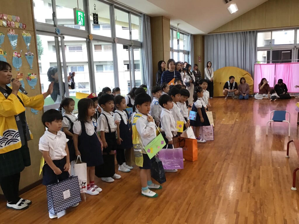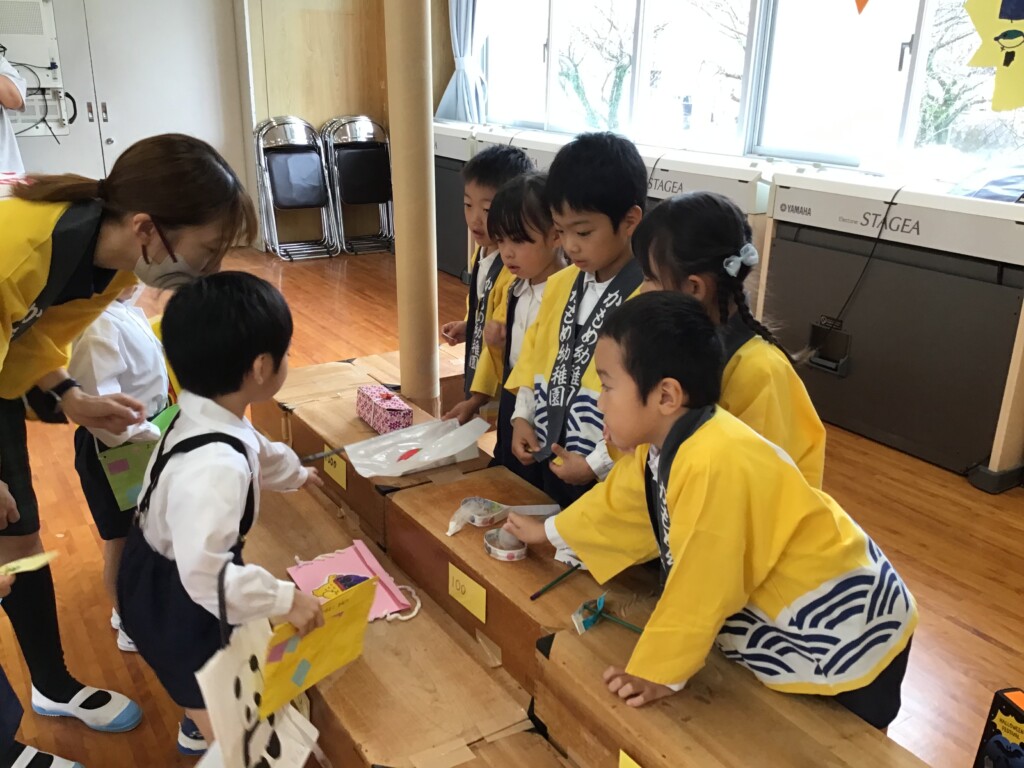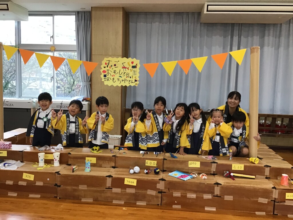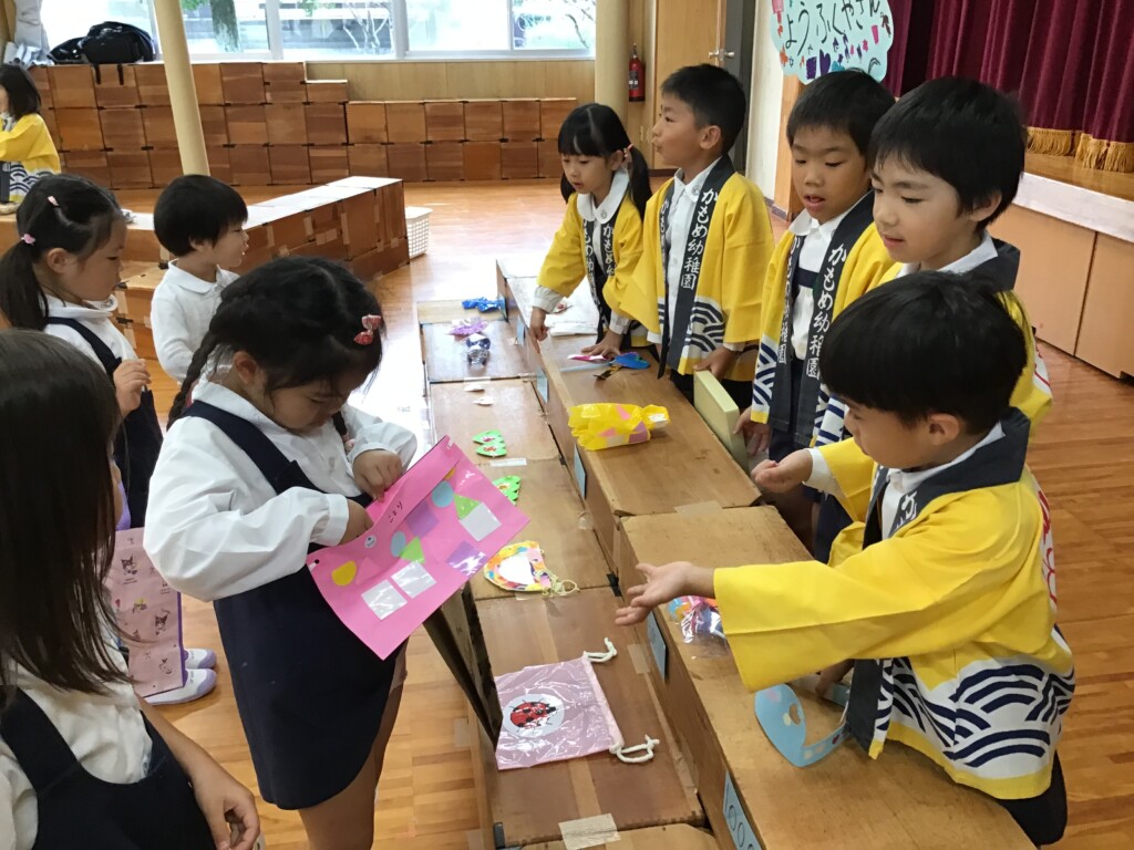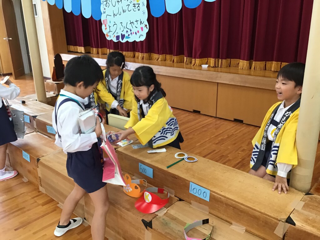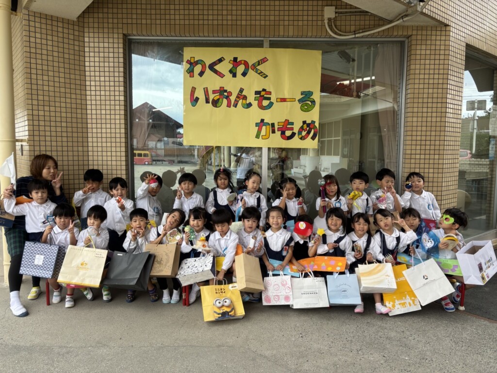 10月24日(金)に、子どもたちが楽しみにしていた年長組と年中組のお店屋さんごっこがありました。お店屋さんごっこに向けて、各クラスで品物作りを楽しんできました。 「わくわくいおんもーるかもめ オープン!」と年長組の元気な声に合わせて、お店屋さんごっこがスタート!年長組は、はっぴを着て大きな声で「いらっしゃいませ~」と声を掛けたり、「お釣りをどうぞ」と優しく声をかけたりする姿が見られました。年中組は、「どのお店から買おうかな?」と迷いながらも、欲しいものを買うことができて大満足♪楽しい1日になりました。
