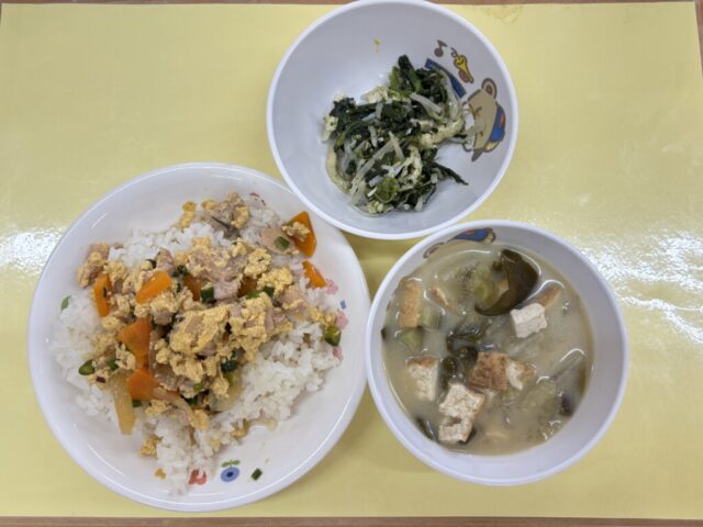 今日の献立は、わかめのみそ汁、親子丼、ほうれん草のおひたしでした。