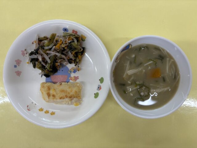 今日の献立は、おくらのみそ汁、鶏肉のコーンマヨ焼き、ゆかり和えでした。