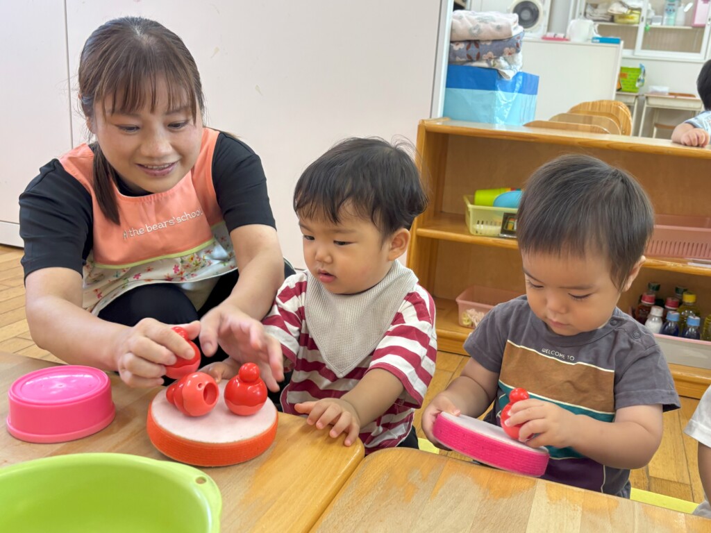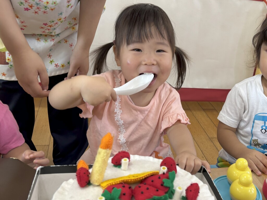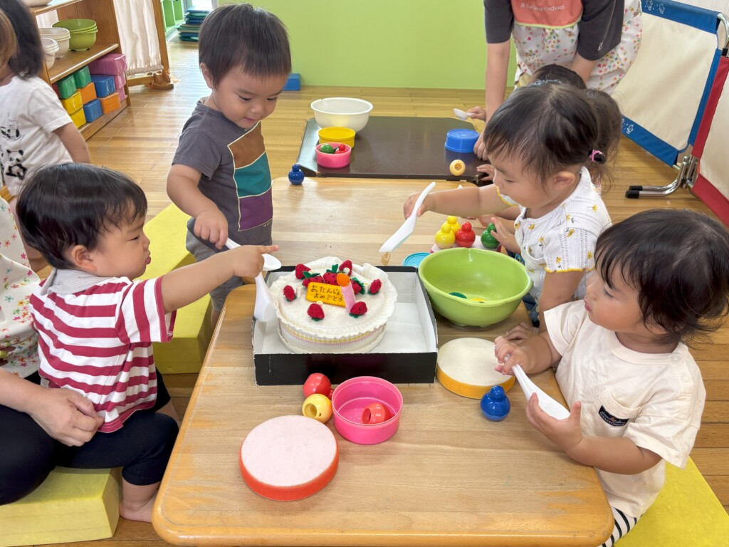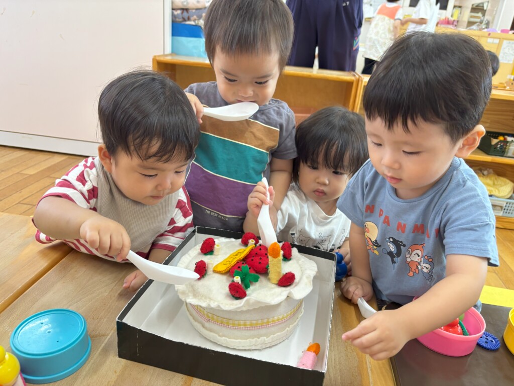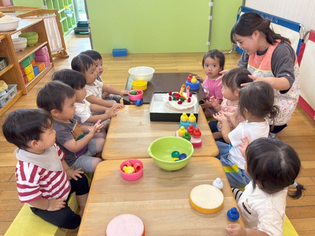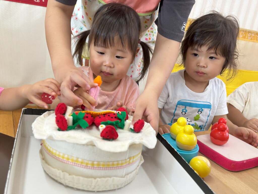 初めての保育園でのお誕生会でしたが、お友達と一緒にマジックテープブロックやプッチンビーズなどの遊具を使って、とても楽しそうにケーキ作りを行っていました😊