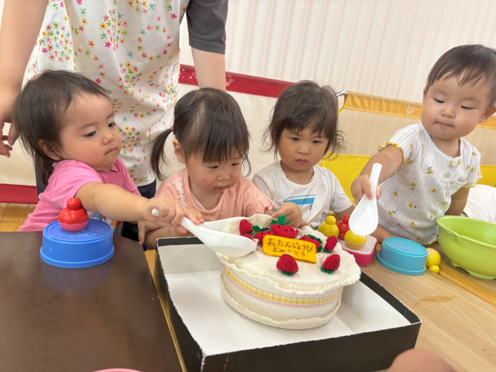 みんなにお誕生日の歌を歌ってもらったり、指で2と示して2歳になったことを喜んだりとお誕生会を満喫しているようでした☆