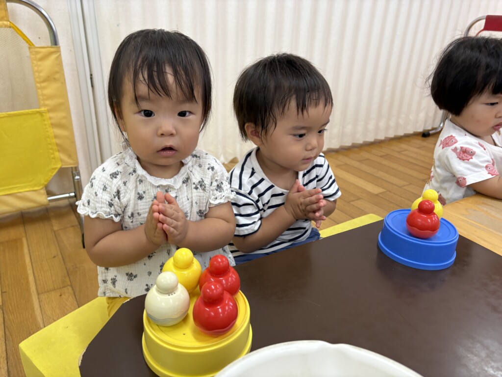 「何歳になりましたか?」と保育者に聞かれると指で2を示そうと頑張るRちゃん😊