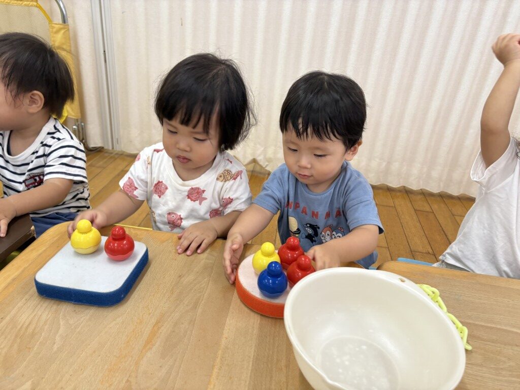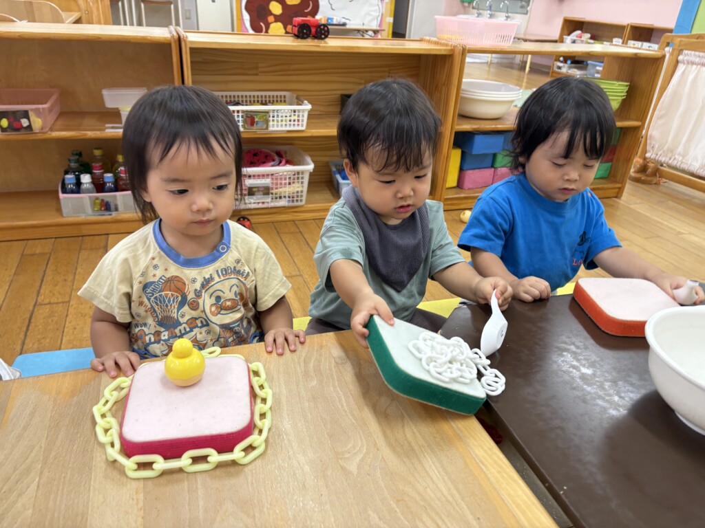 マジックテープブロックやプッチンビーズ、チェーリングなどの遊具を使いながら美味しそうなケーキを作る1歳児さん☆