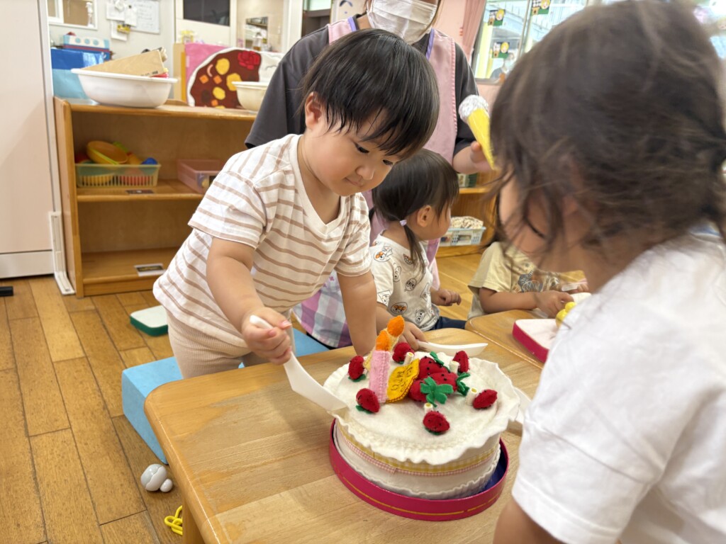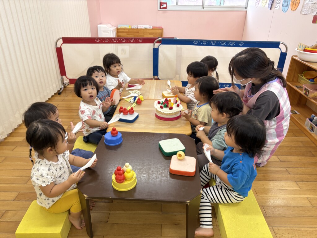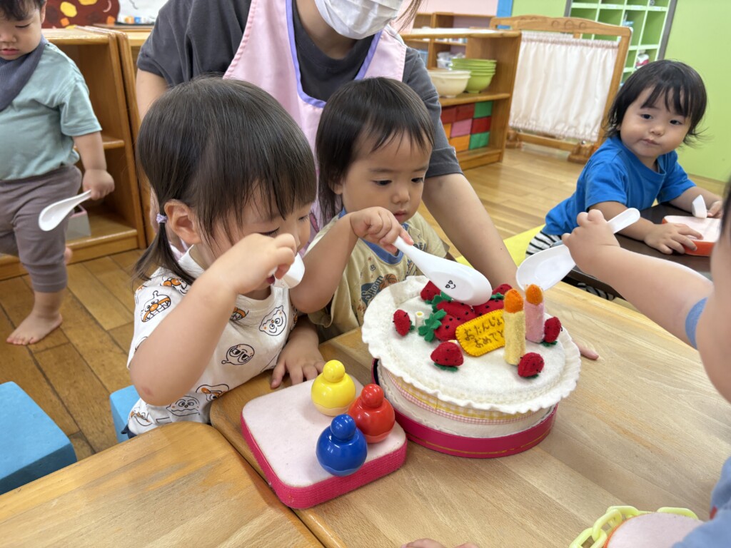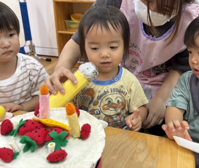 お友達みんなにお歌を歌ってもらったり、おめでとうと言ってもらったりすると少し恥ずかしそうにするRちゃんでしたが、ケーキのろうそくに息を吹きかけるなどしてお誕生会を楽しんでいました!