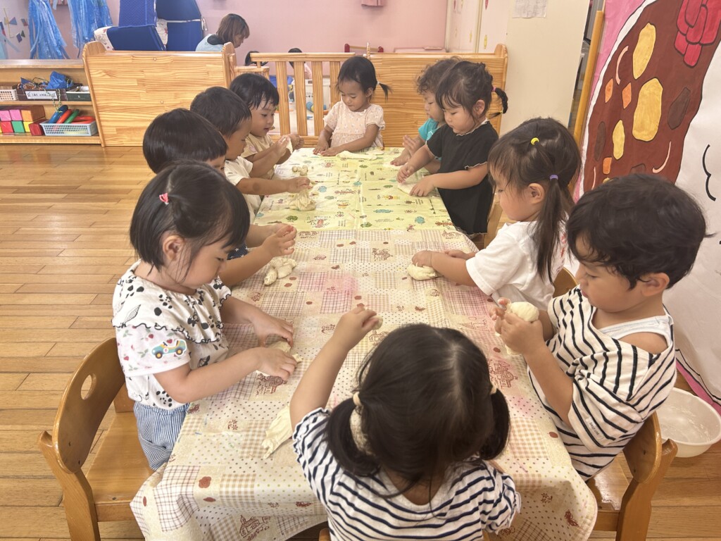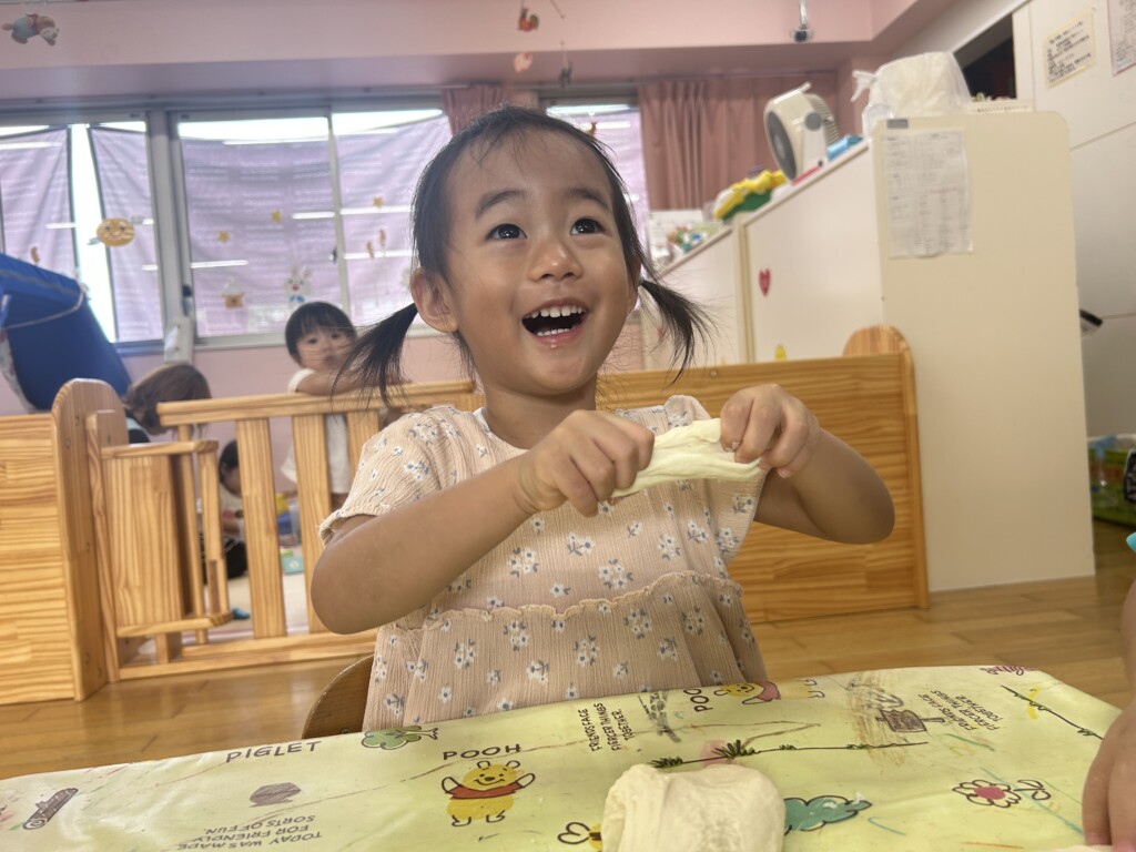 2歳児さんは先週、お部屋で小麦粉粘土遊びも楽しみ、伸ばしたり、お月見団子のように丸めたり、猫などの知っている物をイメージして造形したりと、感触を楽しみながら遊ぶ様子が見られました!