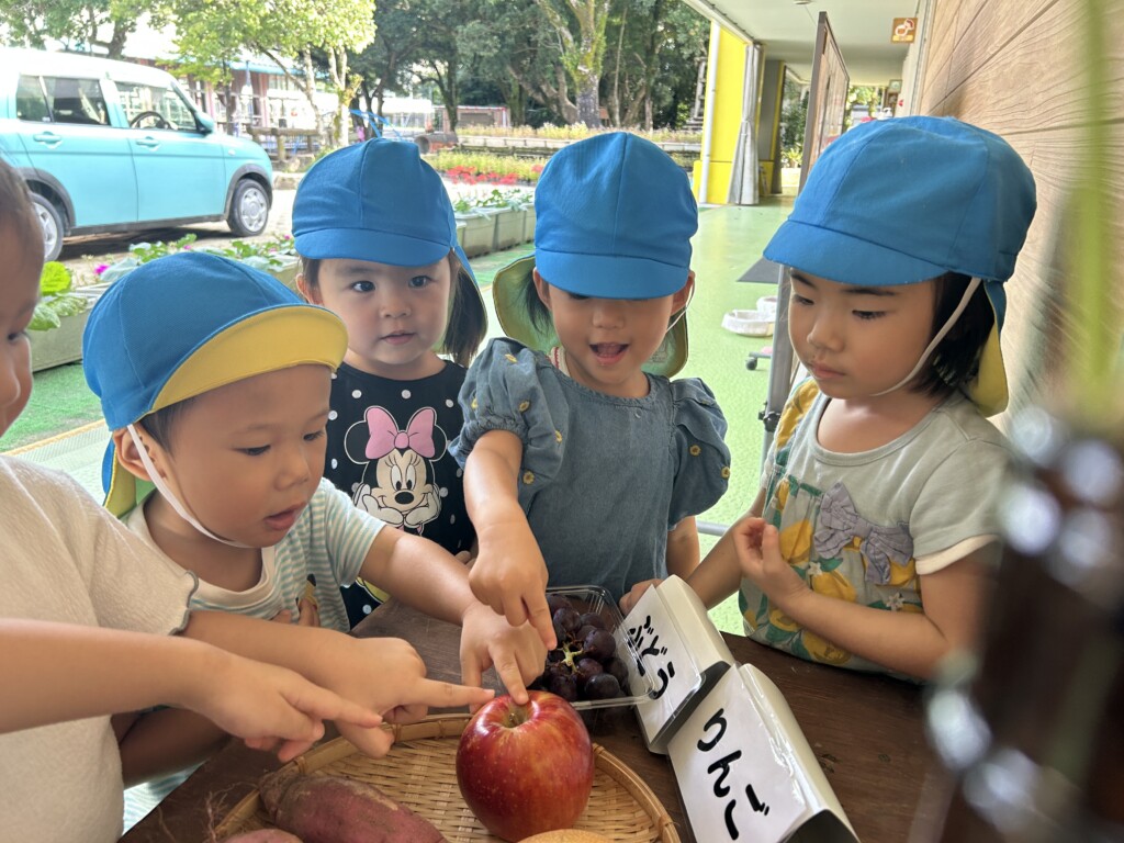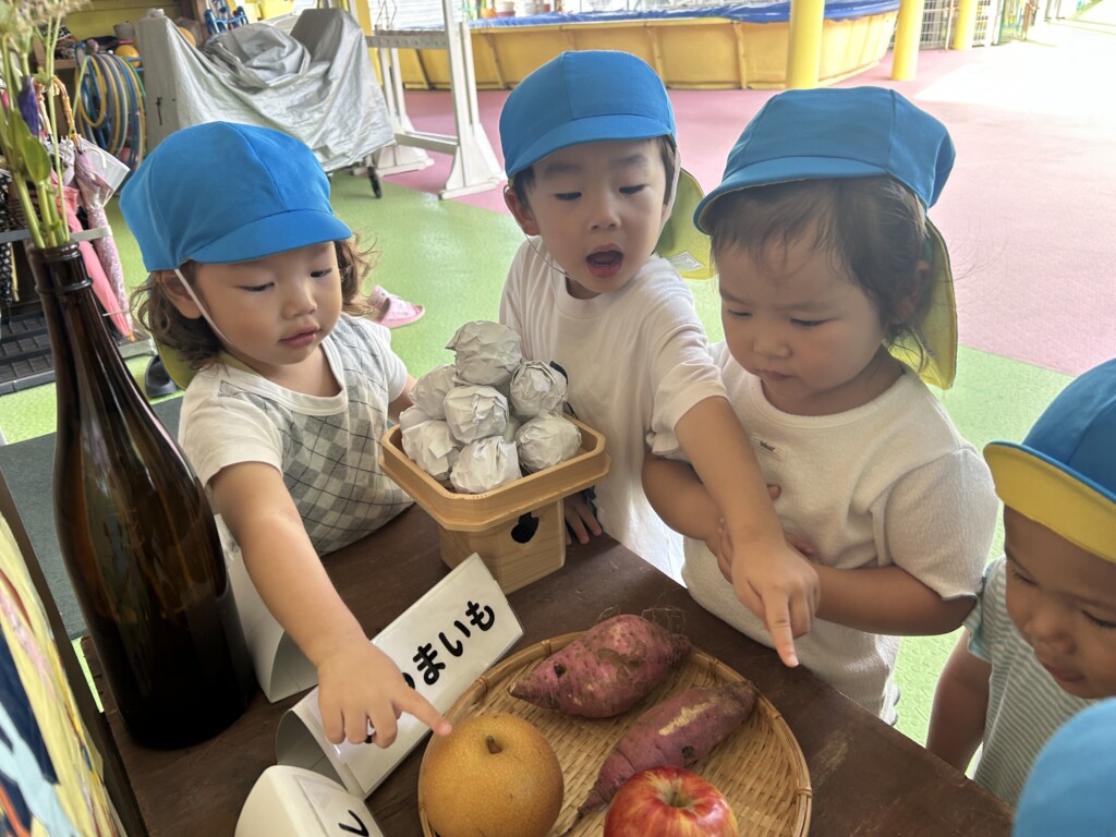 職員室前に飾られているお供え物を見て、「これぶどうだよね!」「りんごだ~!」と知っている果物の名前をお友達と楽しそうにお話しながら見たり、ススキなどの秋のお花を見たりして興味津々で観察する姿が見られました。