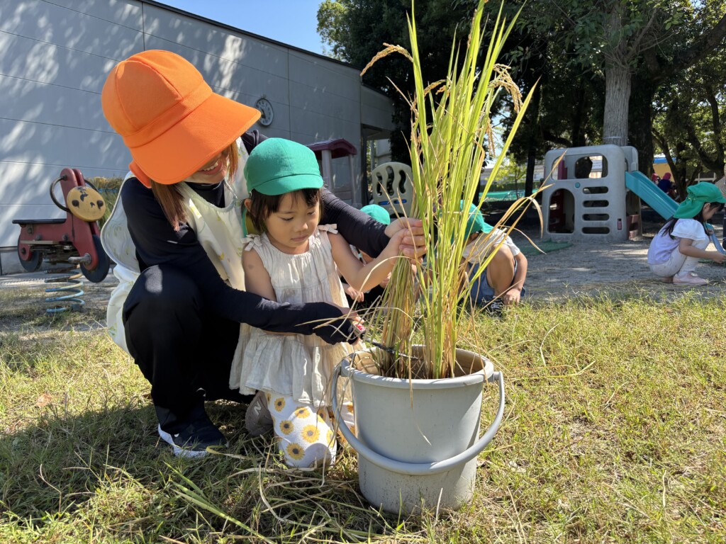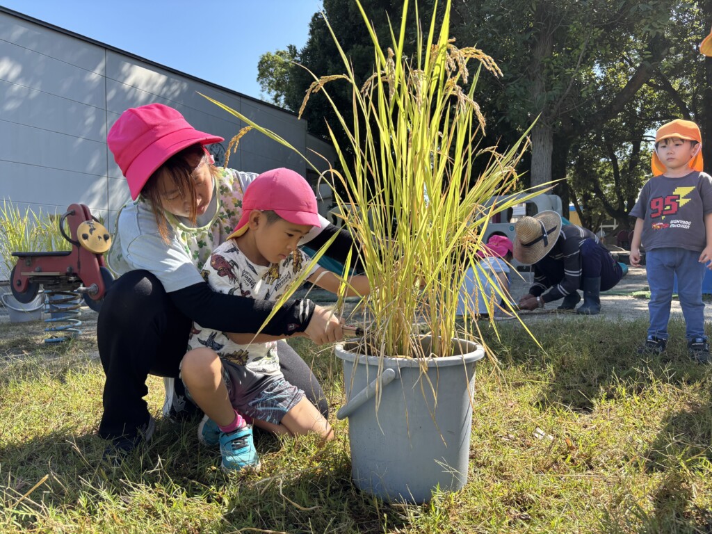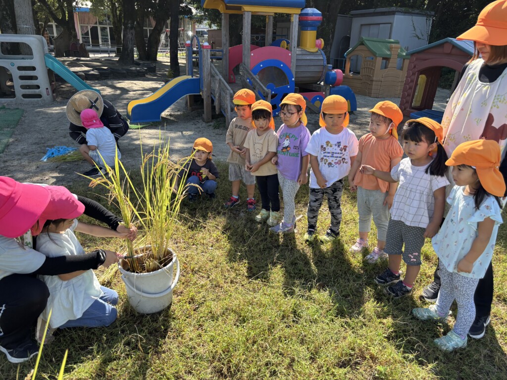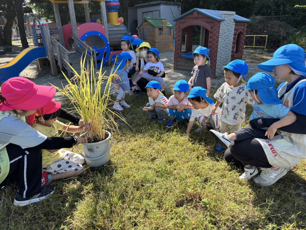 外遊びの時間に、稲が大きく生長していく様子を観察し「まだ緑色の所があるね!」と変化に気づいたり、ネットを張っている理由について話をすると「ここのお米がなくなってる!鳥さんに食べられたのかも!」と気づいたりしていました!