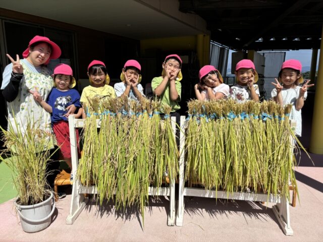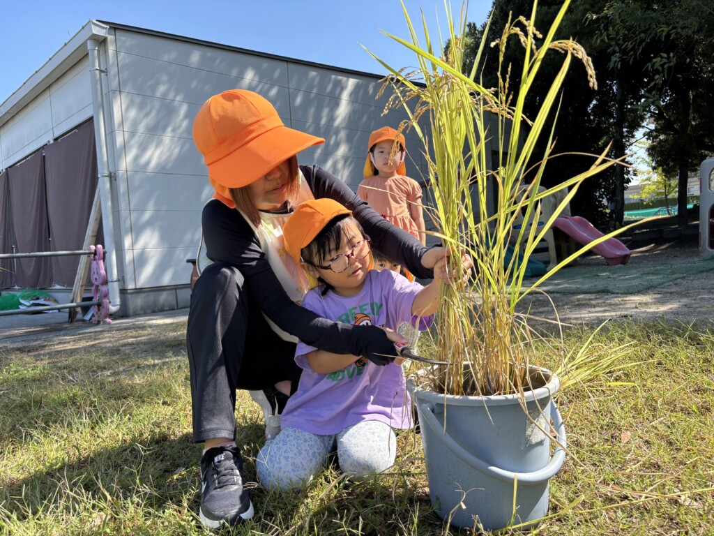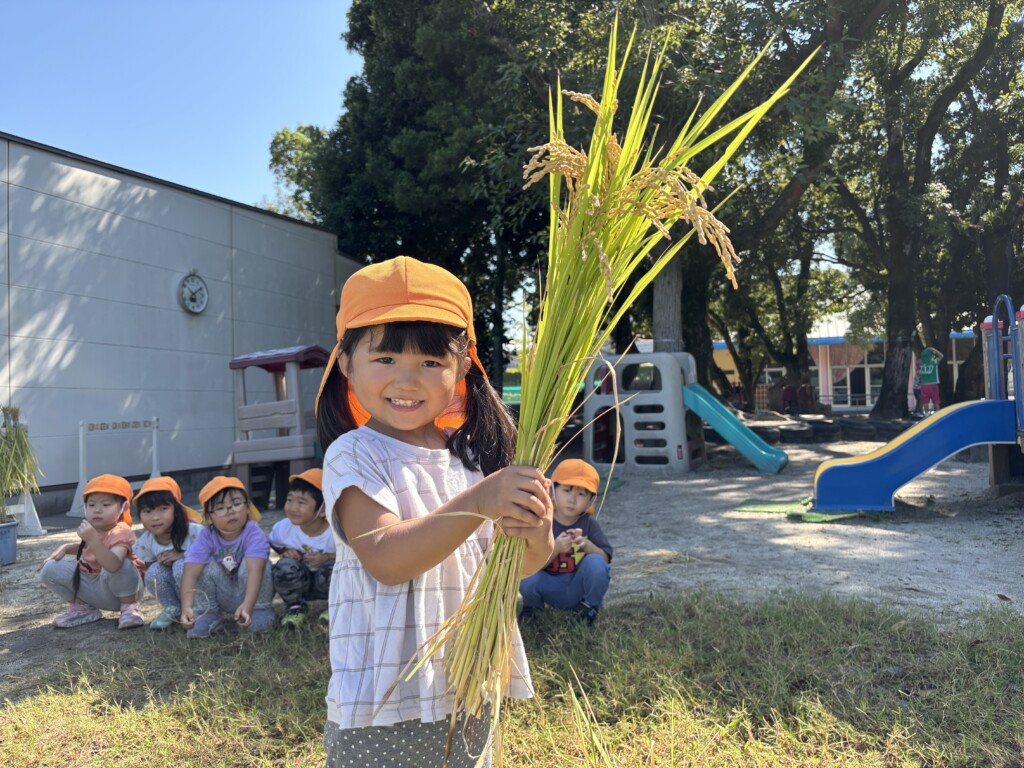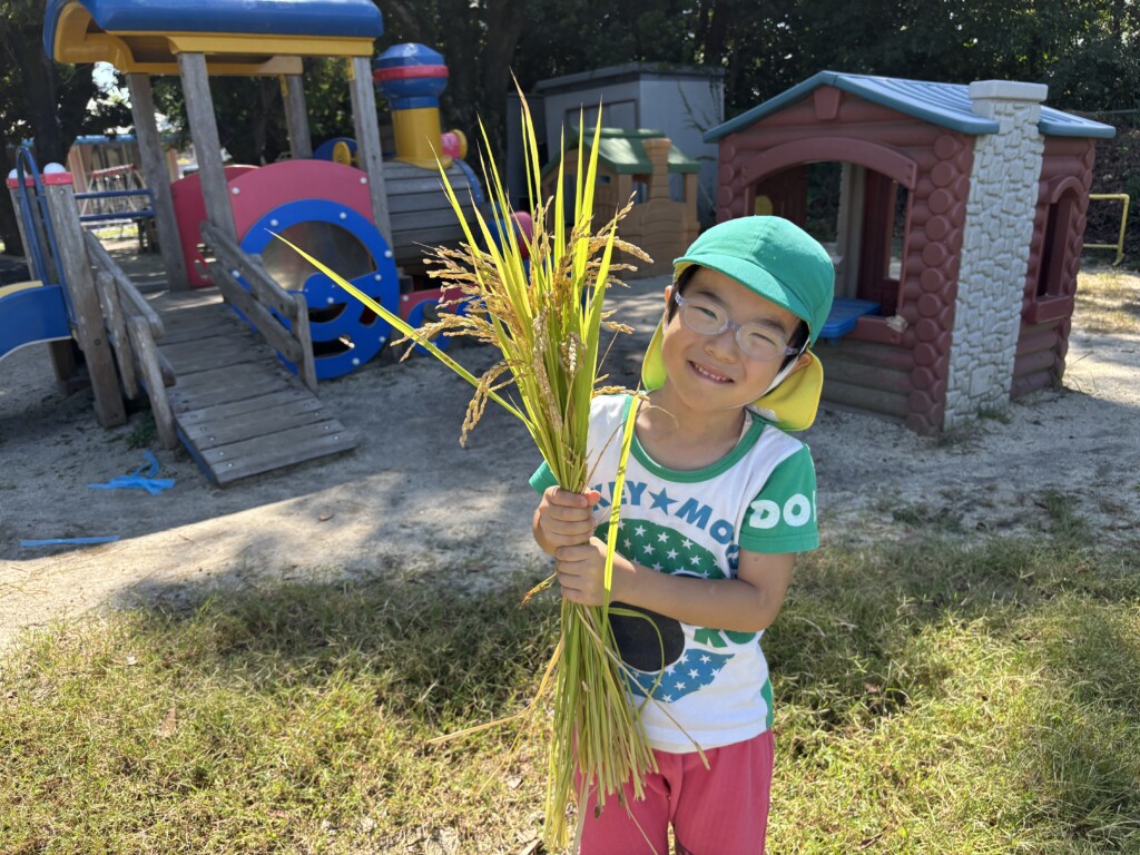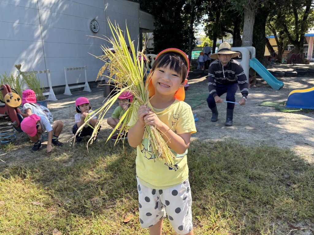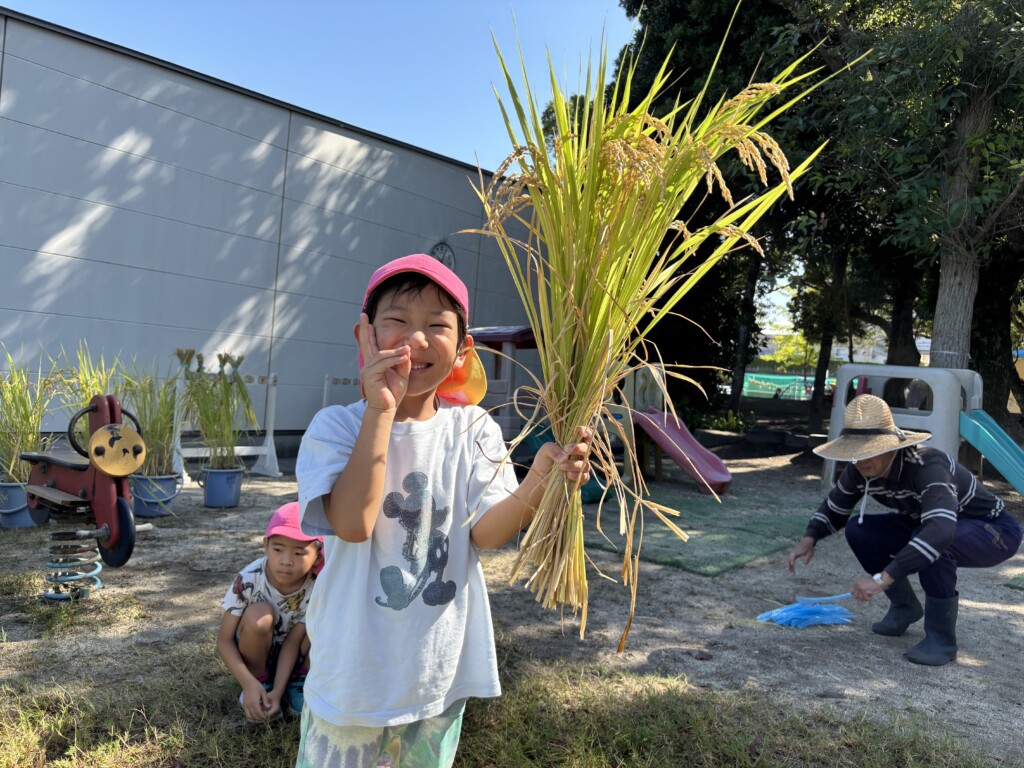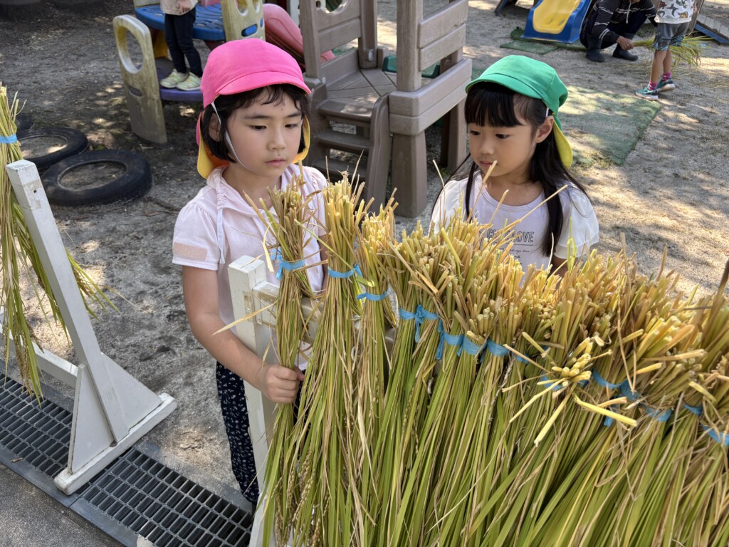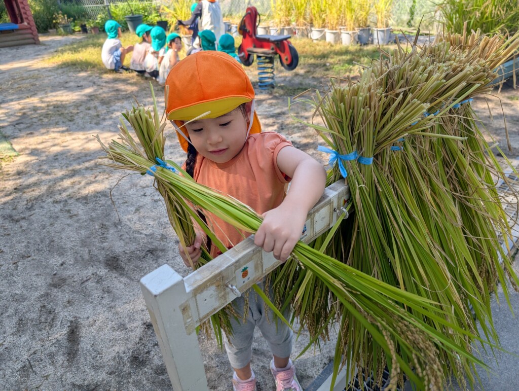 稲刈りの前には、稲の大きさを自分たちの身長と比べて「あれ、小さいな!」と年長さんや年中さんよりは小さいことに気づいたり、稲穂を触って「あっ!かたい!」とお米ができていることを確かめたりすることができました!