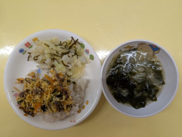 今日の献立は、わかめスープ、ビビンバ、即席漬けでした。