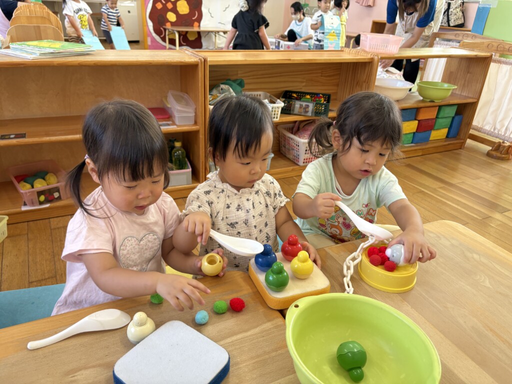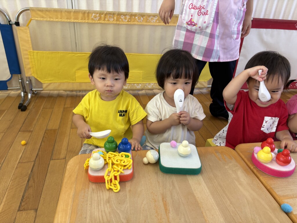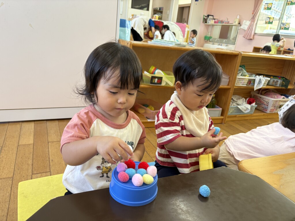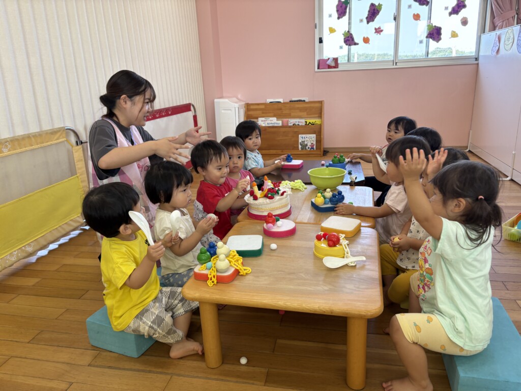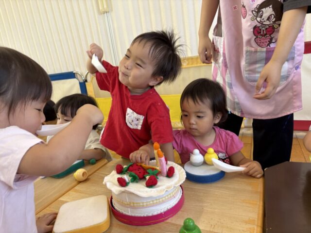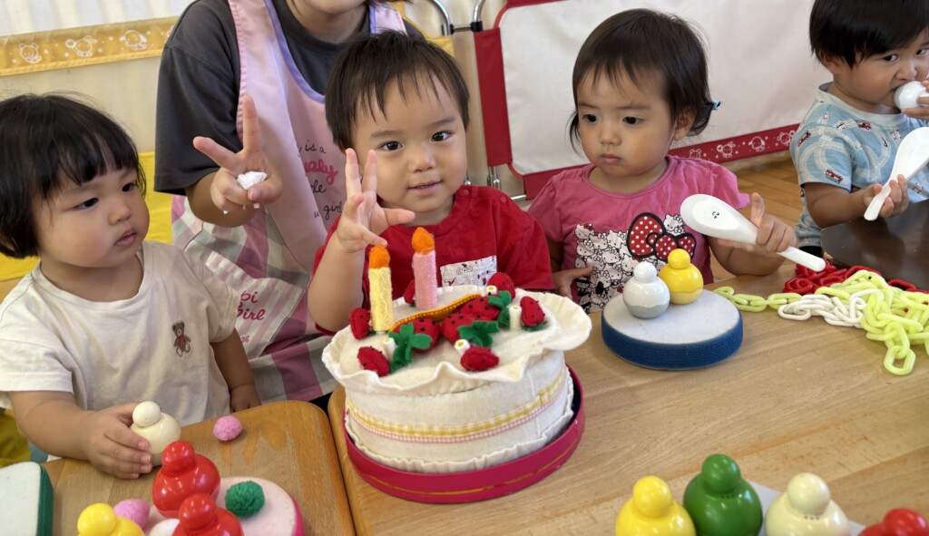 保育者が「何歳になりましたか?」と聞くと、指で2を作って2歳になったことを嬉しそうに教えてくれるMくん!