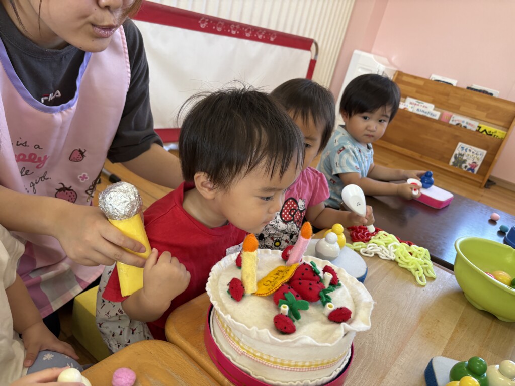 今日は1歳児さんみんなで、明日2歳のお誕生日を迎えるⅯくんのお誕生会をしました!