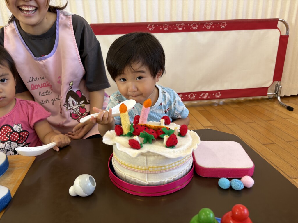 ケーキが出てくると嬉しそうに目を輝かせながらスプーンで食べたり、ろうそくに息を吹きかけたりするなどしてお誕生会を満喫するMくんでした♪