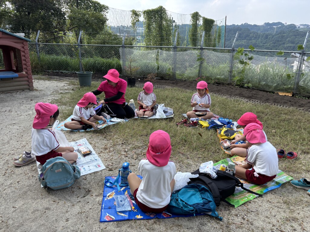 保育園に帰ってきたあとは、なでしこの森の中にシートを敷いて、みんなで丸くなってお弁当の時間!お腹がすいていたようで、パクパク食べていました☆