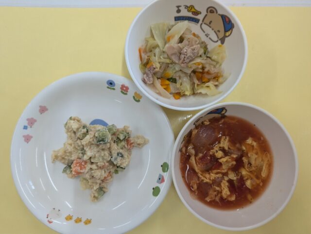 今日の献立は、トマトと卵のスープ、肉野菜炒め、大豆サラダでした。