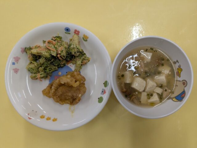 今日の献立は、みぞれ汁、鶏のカレー甘酢和え、ブロッコリーのおかかマヨでした。
