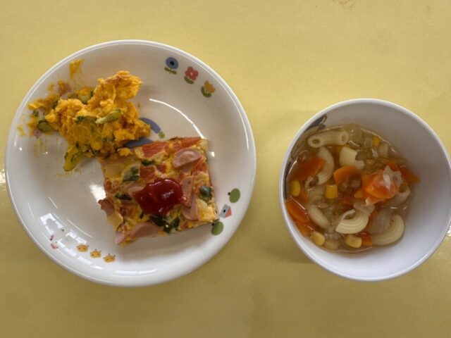 今日の献立は、マカロニスープ、具だくさんオムレツ、かぼちゃサラダでした。