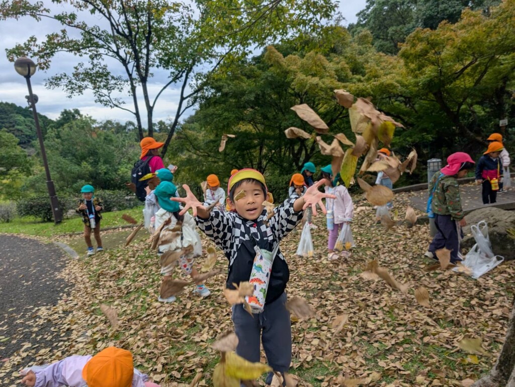 「きれいな色の葉っぱを見つけたよ!」「帽子をかぶってるとどんぐりがあったよ!」