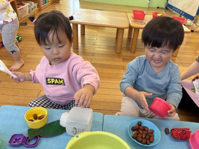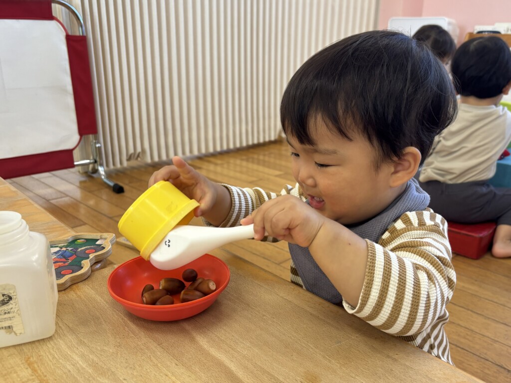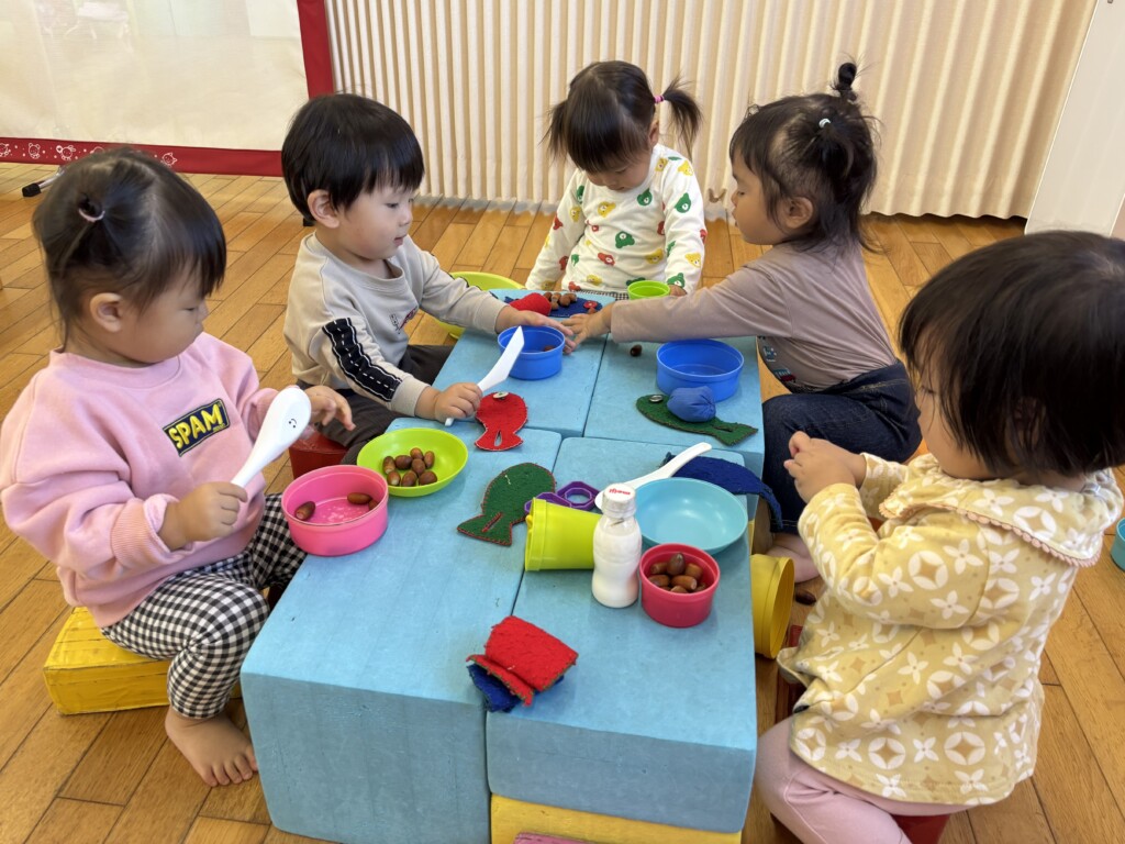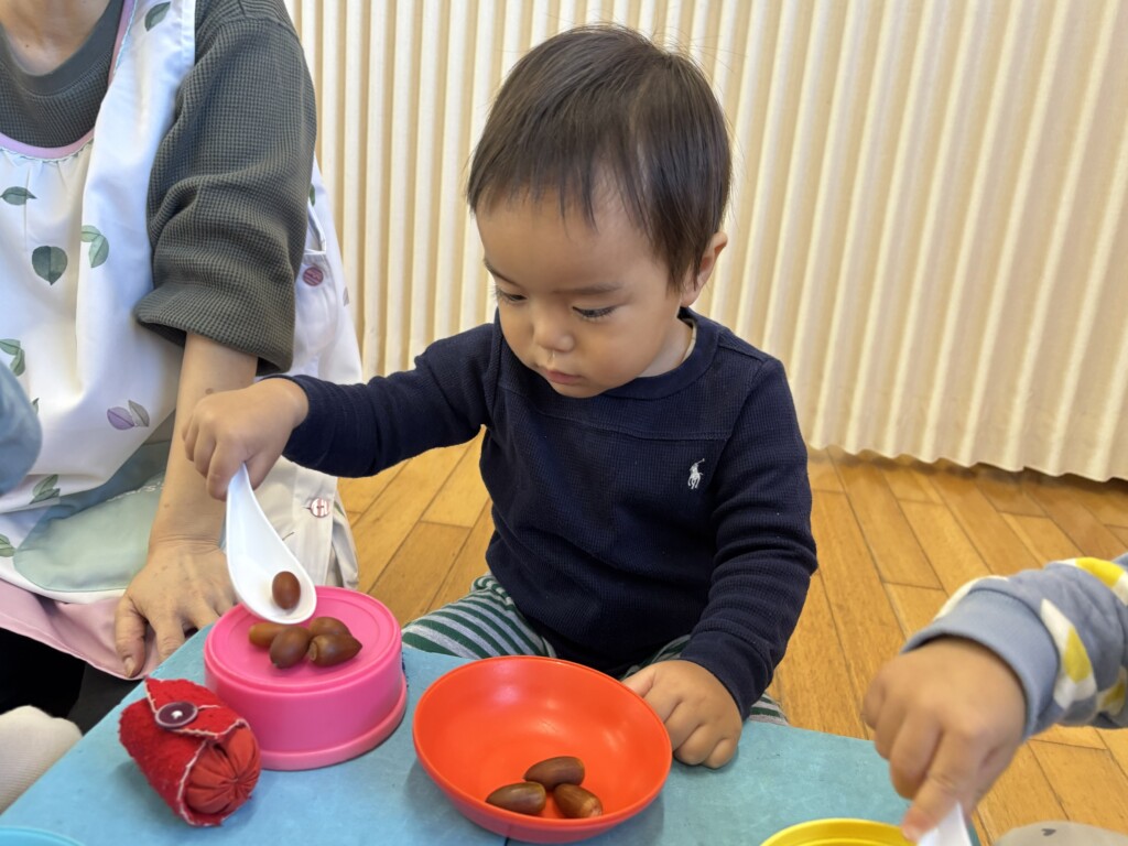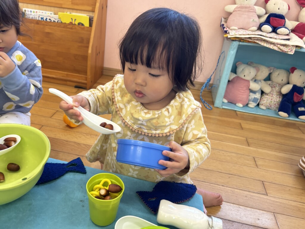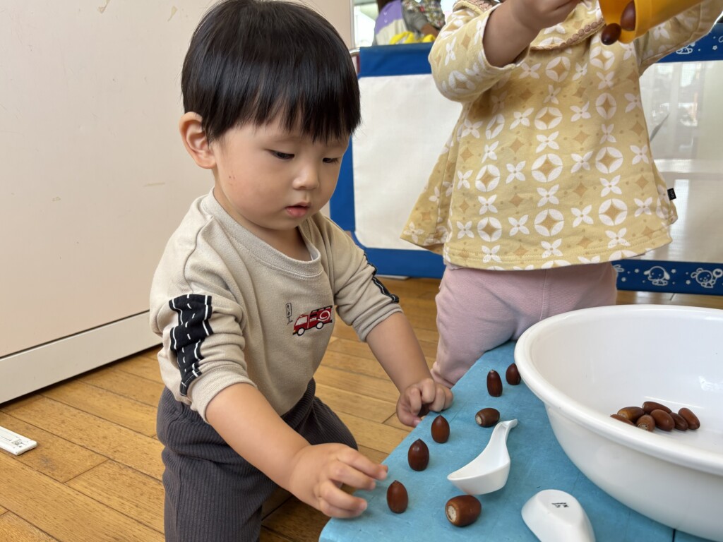 どんぐりを見て目をキラキラさせていたお友達は、すぐにどんぐりを手に取ってコロコロ転がしてみたり、おままごと遊びに取り入れてお料理をしてみたりして、思うままに遊びを試していました♩
