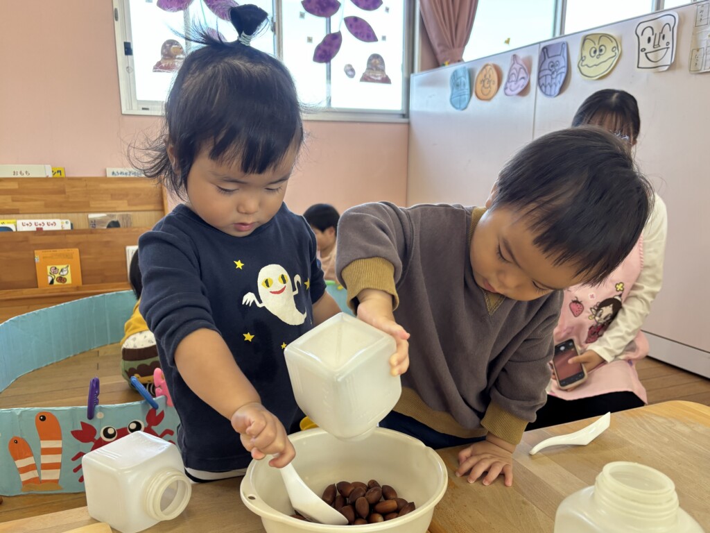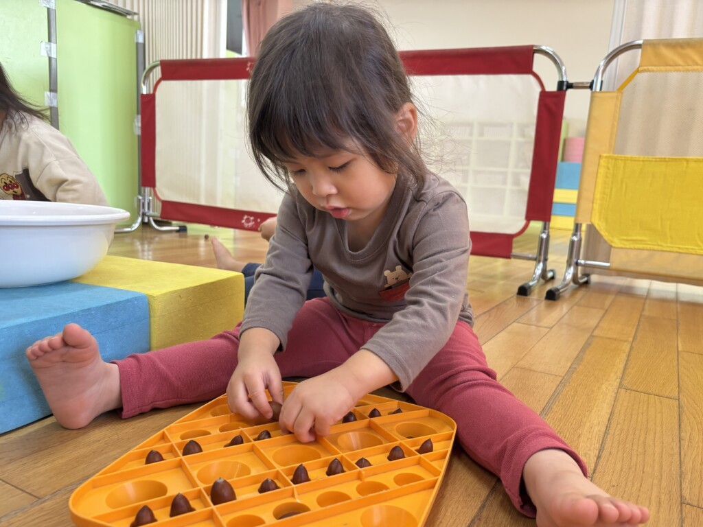 中には、保育者と一緒に「いち、にい、さん・・・」と数を数えたり、どんぐりを立てて並べることに挑戦したりするお友達の姿も見られましたよ!