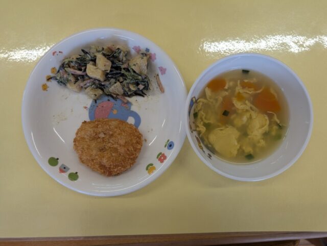 今日の献立は、かきたま汁、チキンカツ、にぎやかサラダでした。