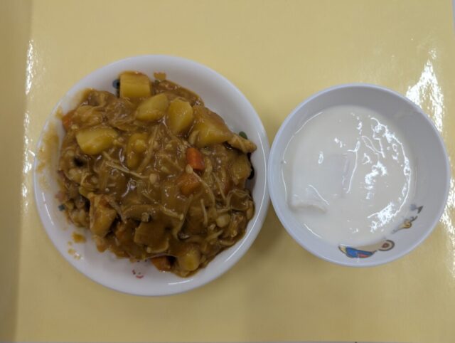 今日の献立は、きのこカレーライス、バナナヨーグルトでした。