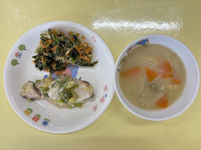 今日の献立は、さつま芋のみそ汁、魚のねぎ焼き、野菜のごま和えでした。