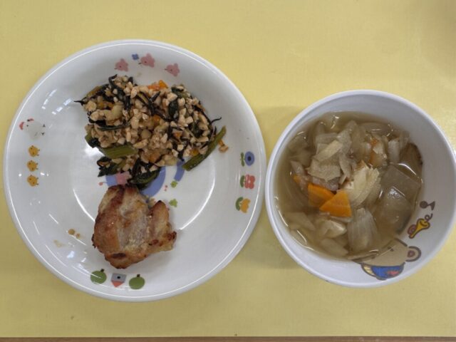 今日の献立は、根菜のすまし汁、鶏のみそ焼き、納豆の五菜和えでした。