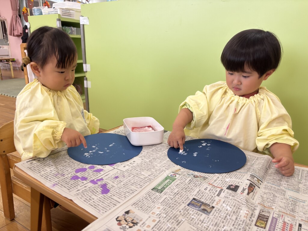 指に白の絵の具をつけて画用紙にポンポンと押す1歳さん!絵の具の感触を楽しみながら画用紙にいっぱい絵の具をつけて、綺麗な雪をつくっていました。
