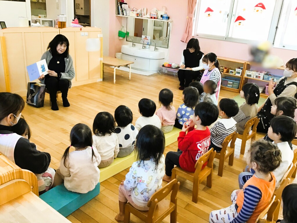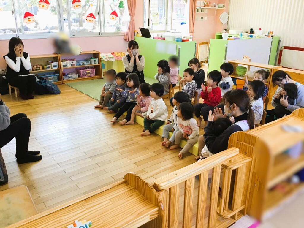 りす組、ぱんだ組ともに、冬やクリスマスにちなんだ絵本やわらべうた遊びを取り入れてくださったことで、興味津々な子どもたち。