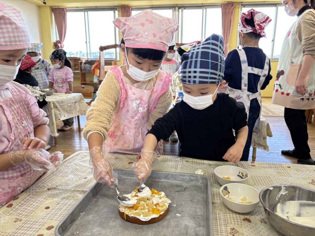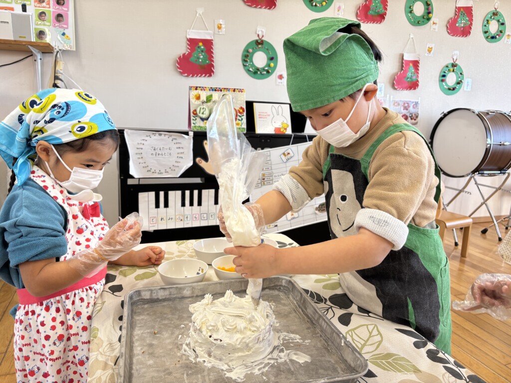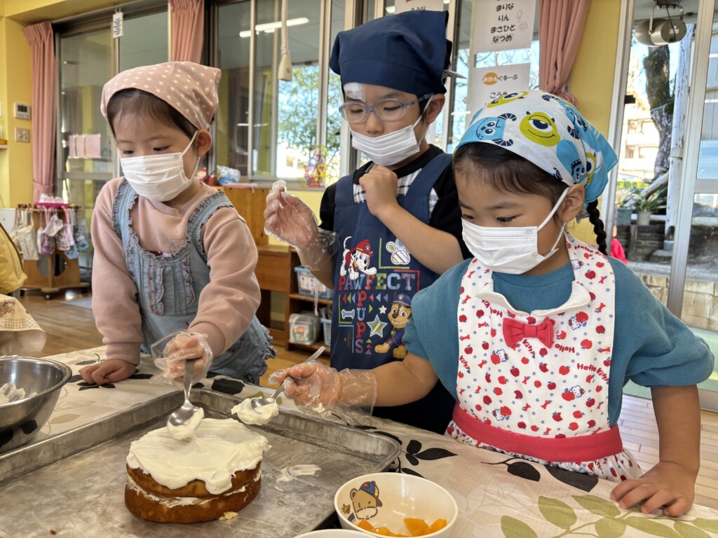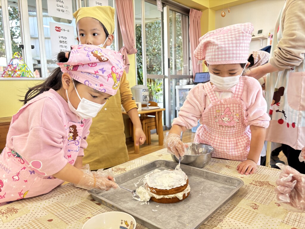 グループのお友達と協力してクリームを塗ったりデコレーションしたり、