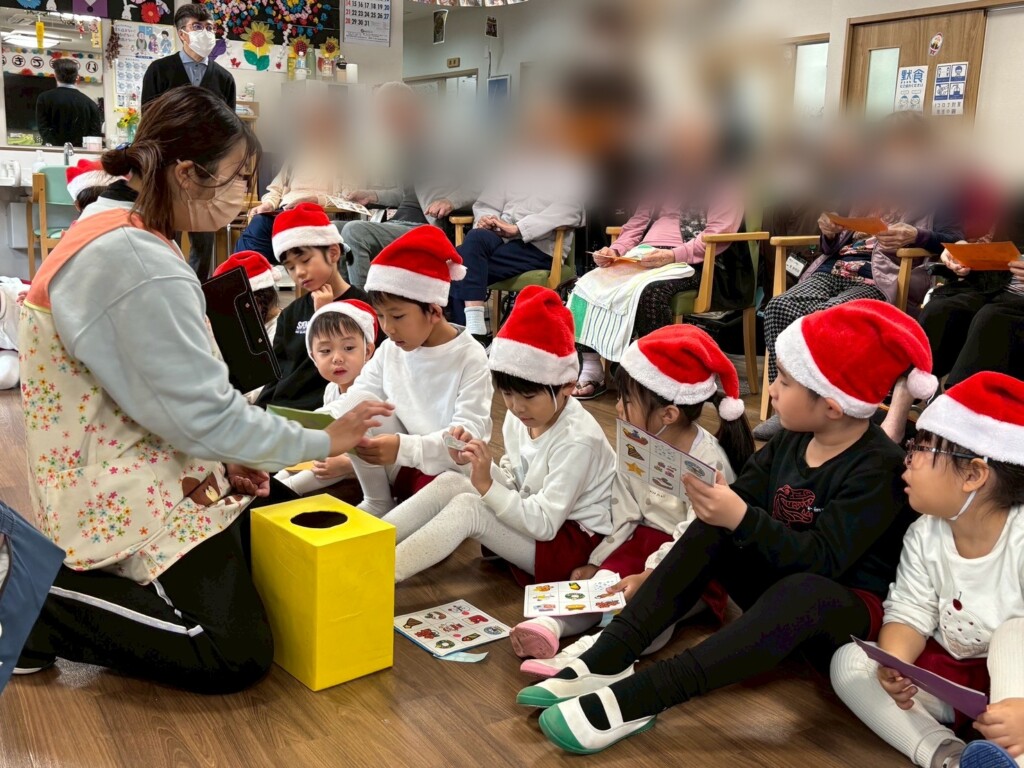 年長さんにクジを引いてもらい、自分のカードと引かれたイラストを見比べながら
