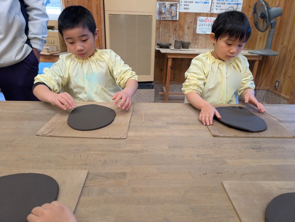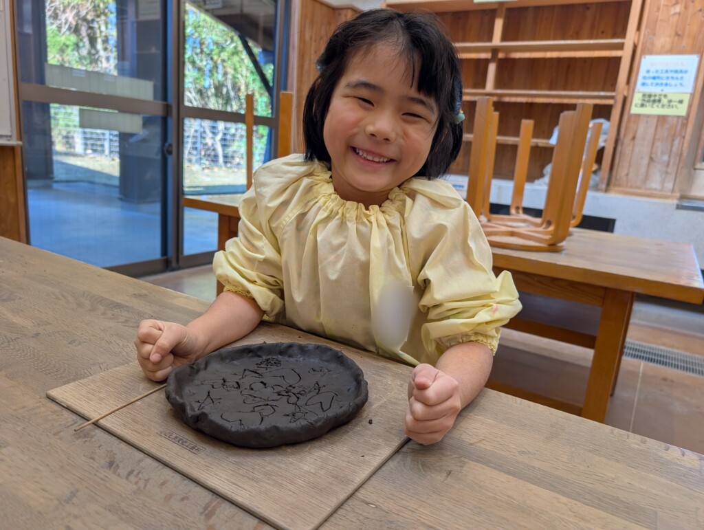 縁を作る作業は、縁の粘土の厚さを薄くしないように気をつけながら曲げる作業で、少し難しそうでしたが、「こんな感じ?」「これでいいかな?」と聞きながらお皿の形を作ることができていましたよ♪