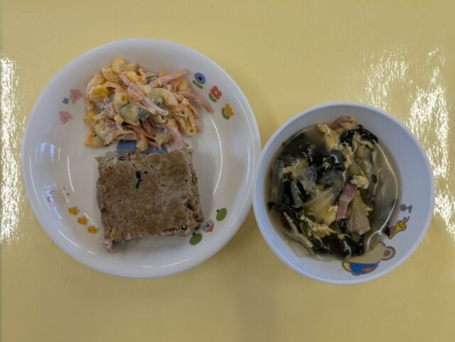 今日の献立は、ポパイスープ、スタミナハンバーグ、マカロニサラダでした。