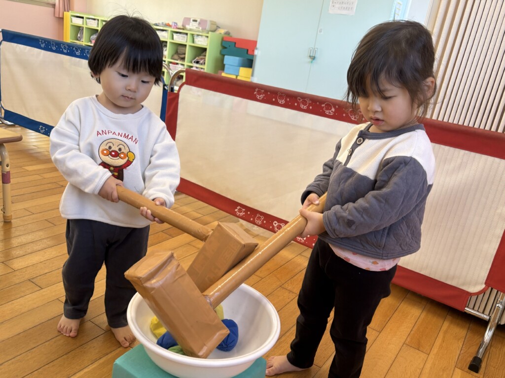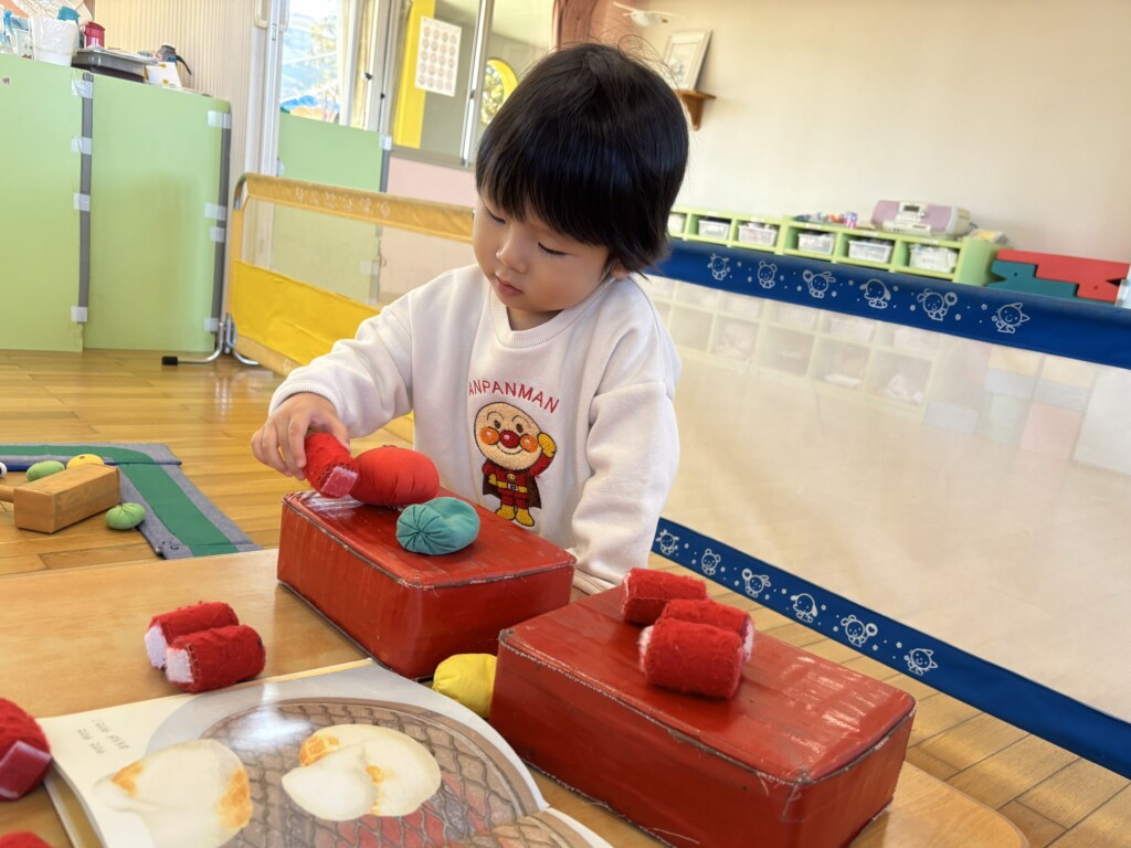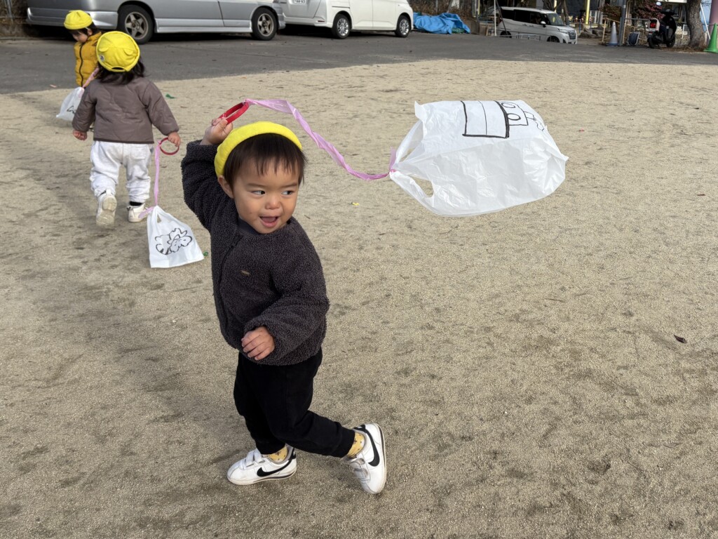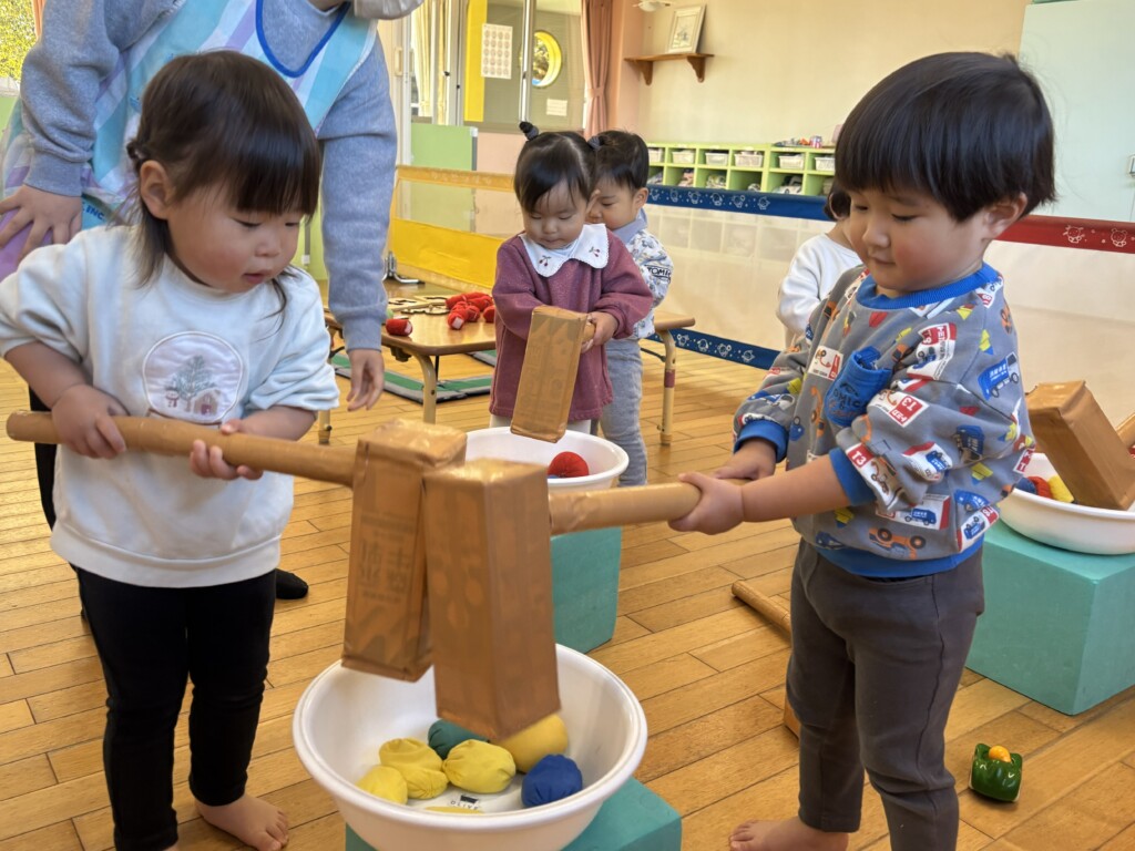 お正月ならではの遊びを十分に楽しむことができるように、凧揚げやもちつき遊び、マークかるた遊びを取り入れると、どの遊びも興味津々で、保育者の話をよく聞きながらお友達と一緒に遊ぶことを楽しんでいます😊