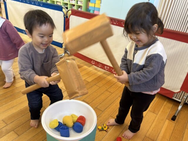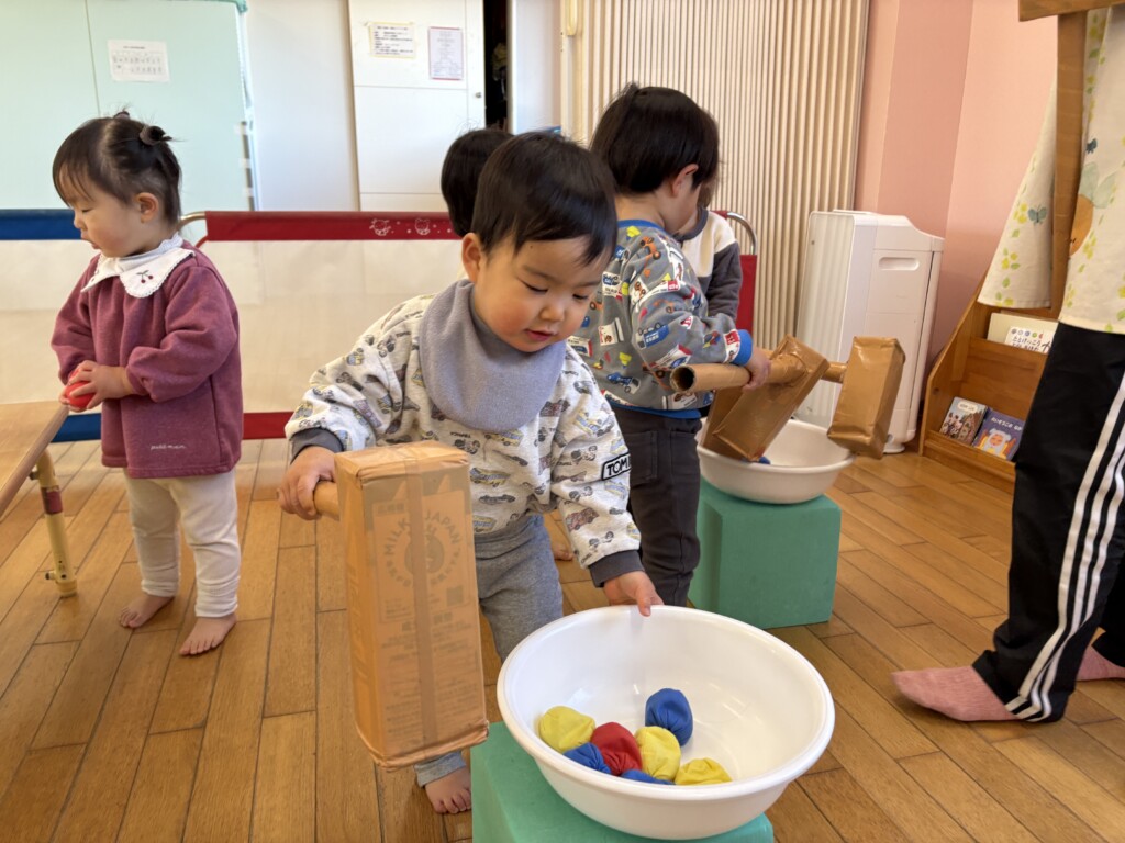 好奇心旺盛で、お友達や保育者と色んな遊びにチャレンジして楽しんでいる1歳児さん!!