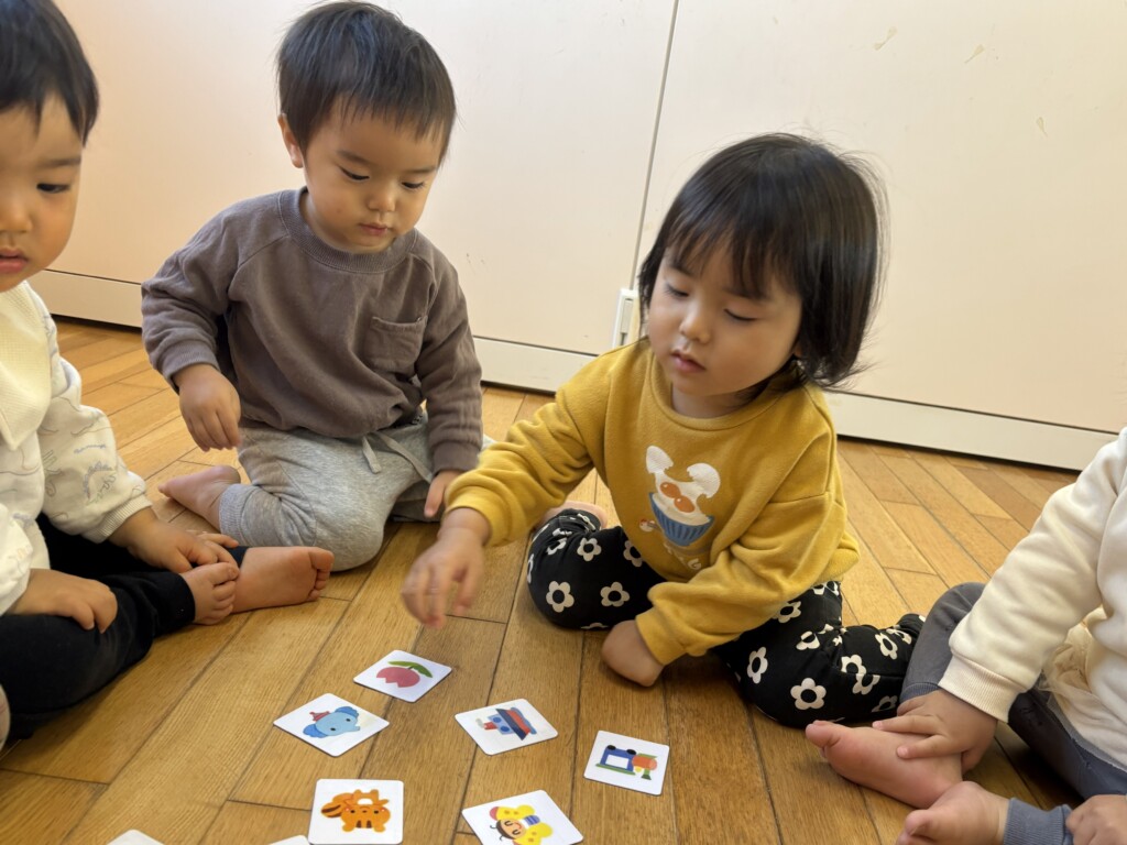 中でもかるた遊びでは、保育者が「〇〇ちゃんのマーク」や「いちごマーク」など、マークの名前を伝えると、じっとカードを見て集中して探したり、嬉しそうにカードを取ったりすることもできていますよ✨