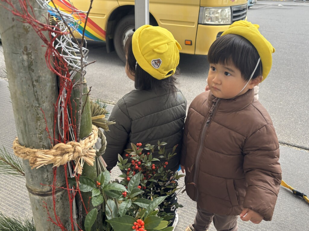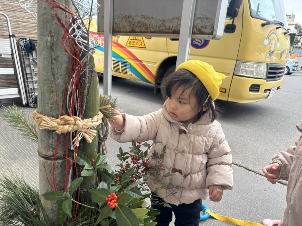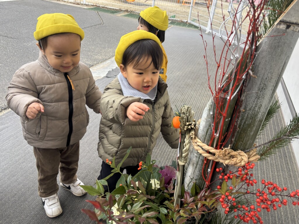 「これなに?」と保育者に尋ねたり、「かどまつ」「かがみもち」と保育者の言葉を真似したりして、関心を持つ姿が見られています♩