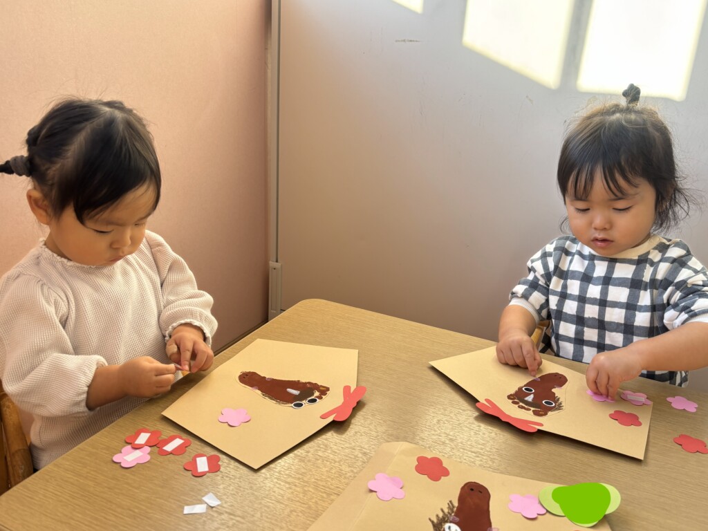また、1月の製作では足形で馬の顔を作ったり、お花のシールを飾ったりして絵馬作りもしました♩