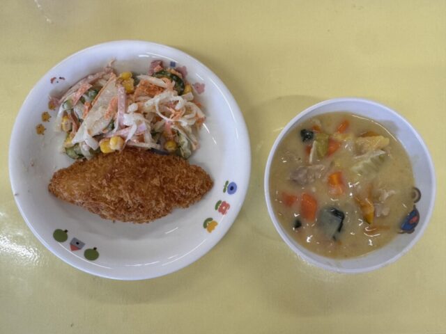 今日の献立は、クリームシチュー、白身魚フライ、大根サラダでした。