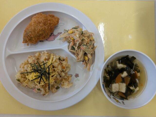 献立は、ちらし寿司、すまし汁、鮭のチーズフライ、ごぼうサラダでした。