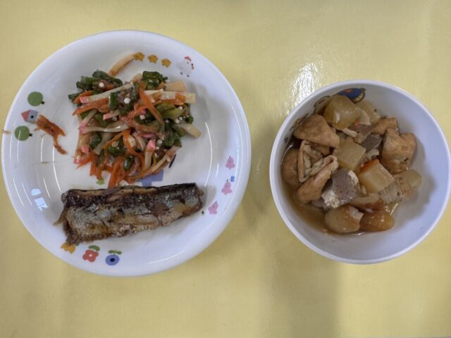 今日の献立は、おでん風、いわしの生姜煮、おくらの土佐和えでした。