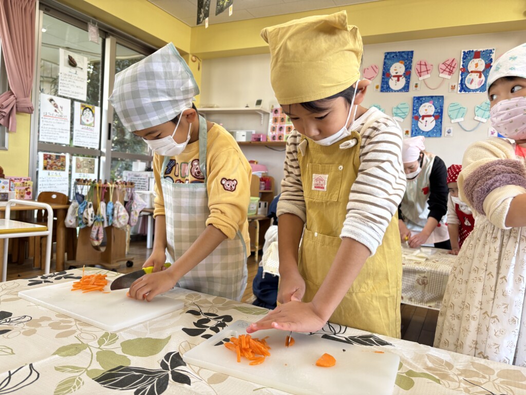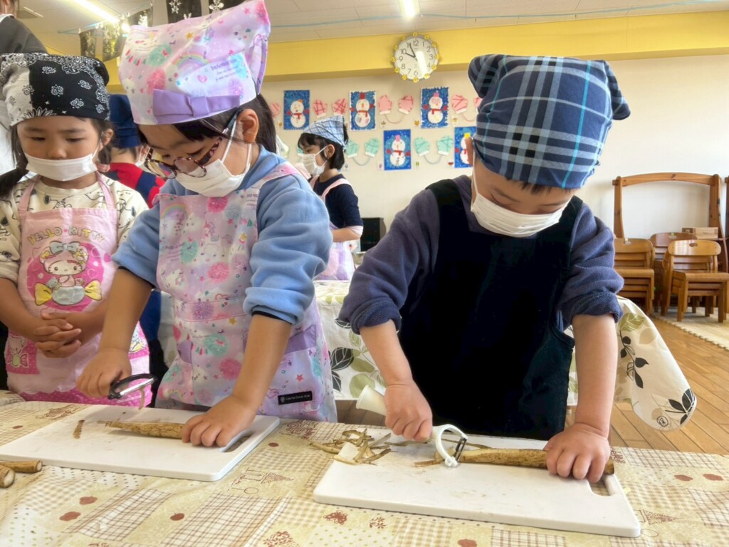 年中さんは、人参の皮をピーラーを使って剥いたり、人参や大根、しいたけを小さく切ったりしました!