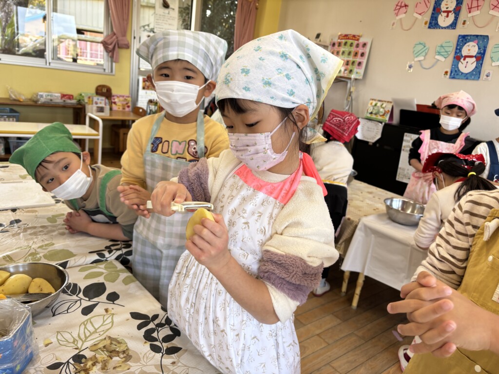 年長さんは、ジャガイモの皮を剥いて切ったり、ブロッコリーやにんじんの細切りをしたりと
