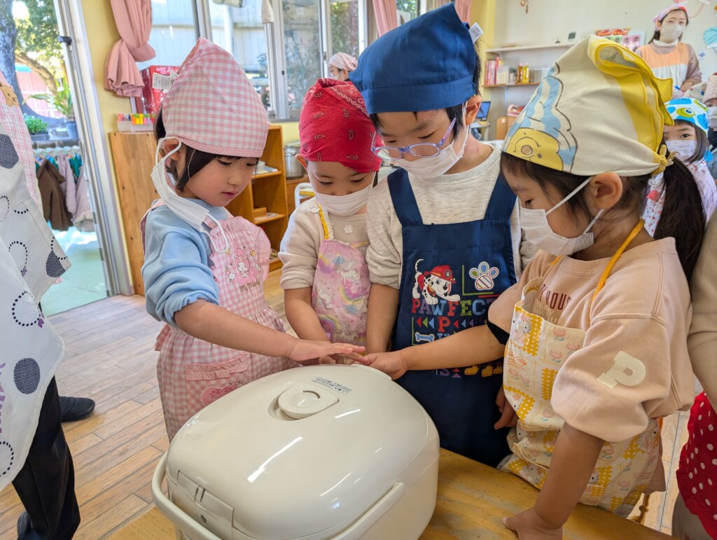 切り終わると、年長さんが炊き込みご飯の調味料を入れたり、みんなで切った具材を入れて