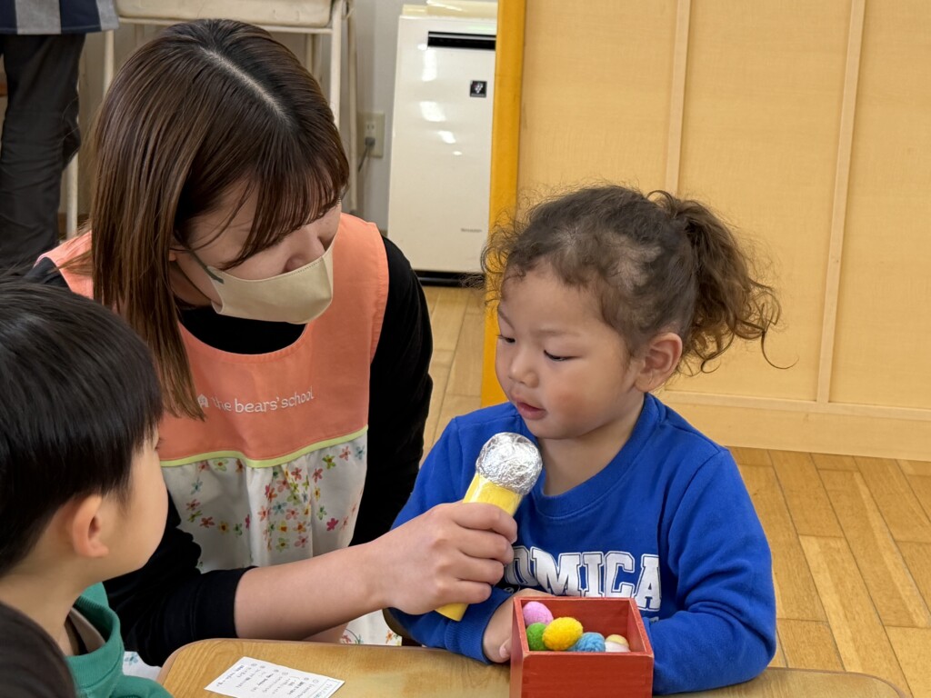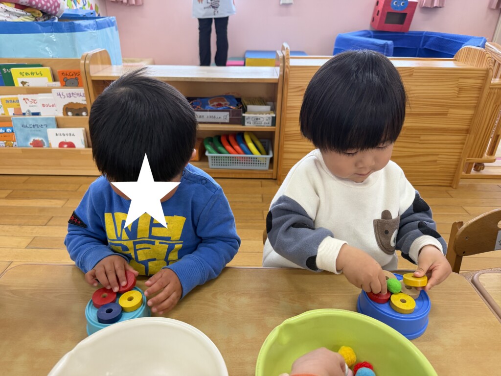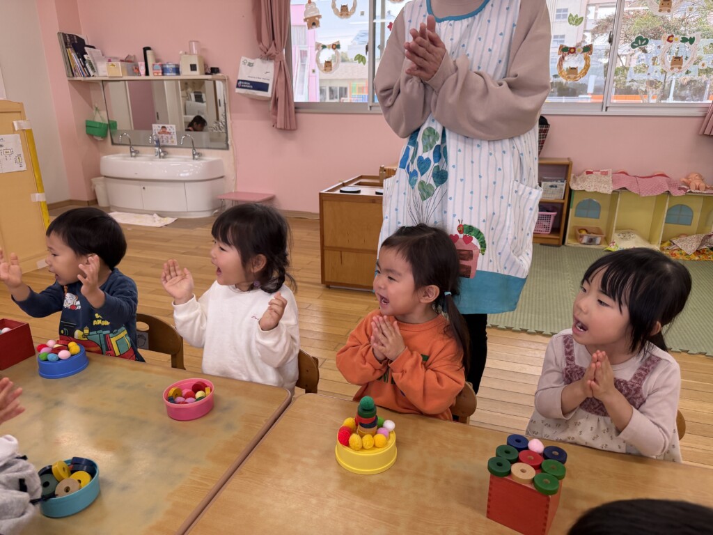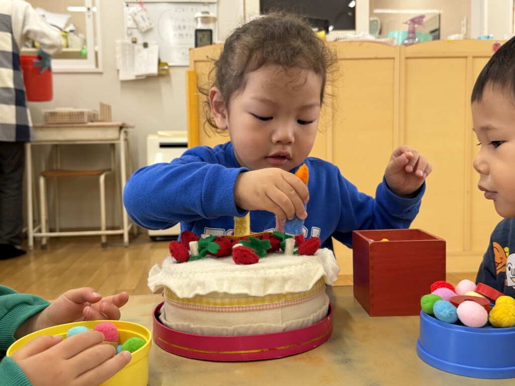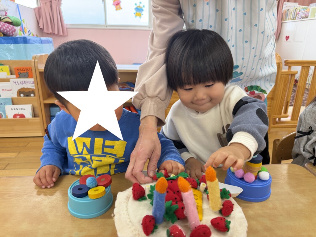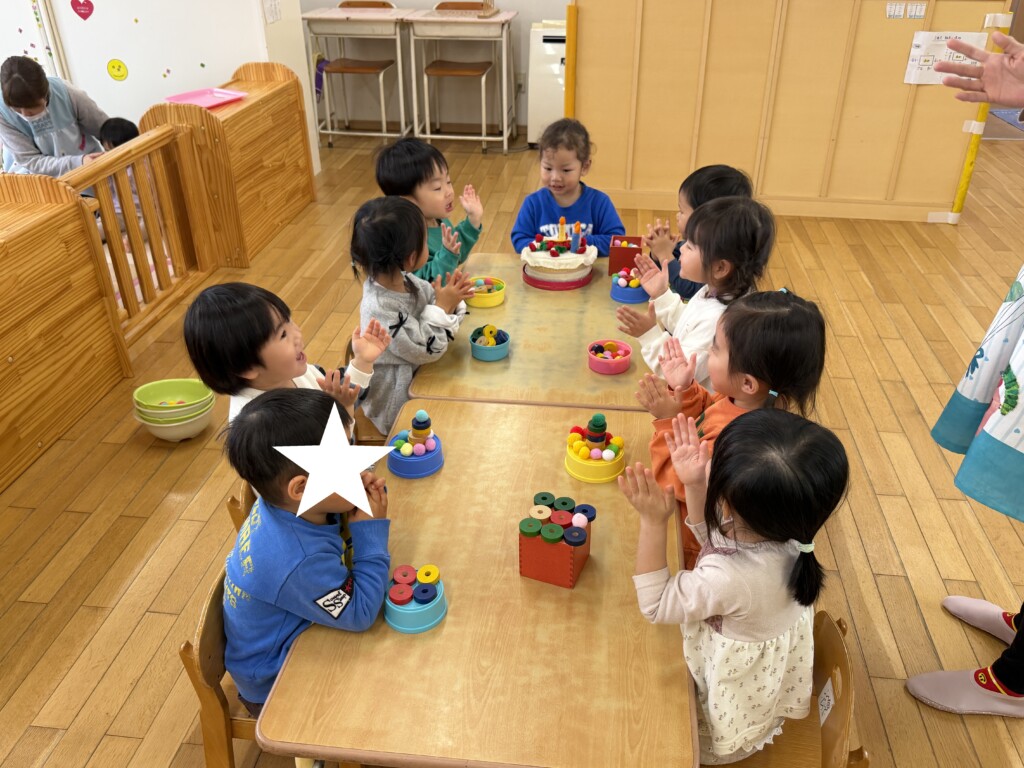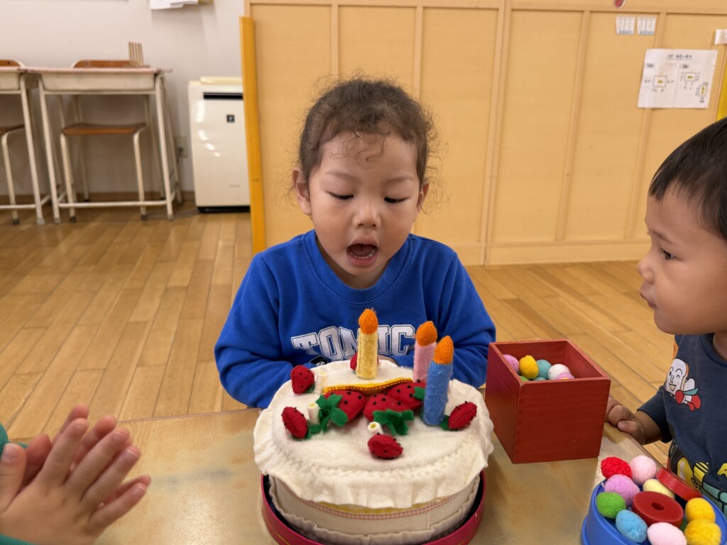 登園してすぐに2歳児さんのお友達から「Yくんお誕生日おめでとう~!」と次々に声をかけられ、なんだか照れくさそうにしていたYくん。