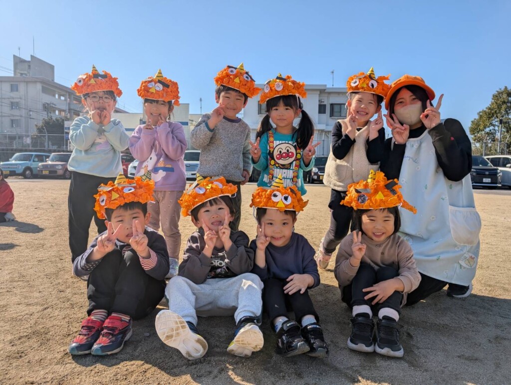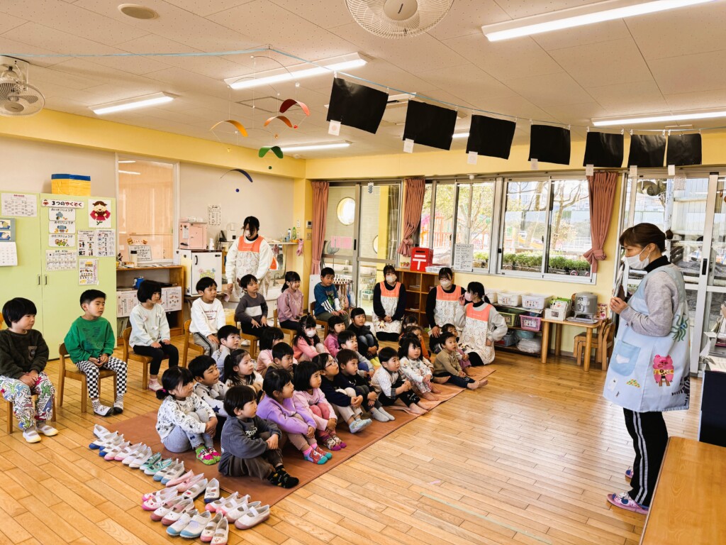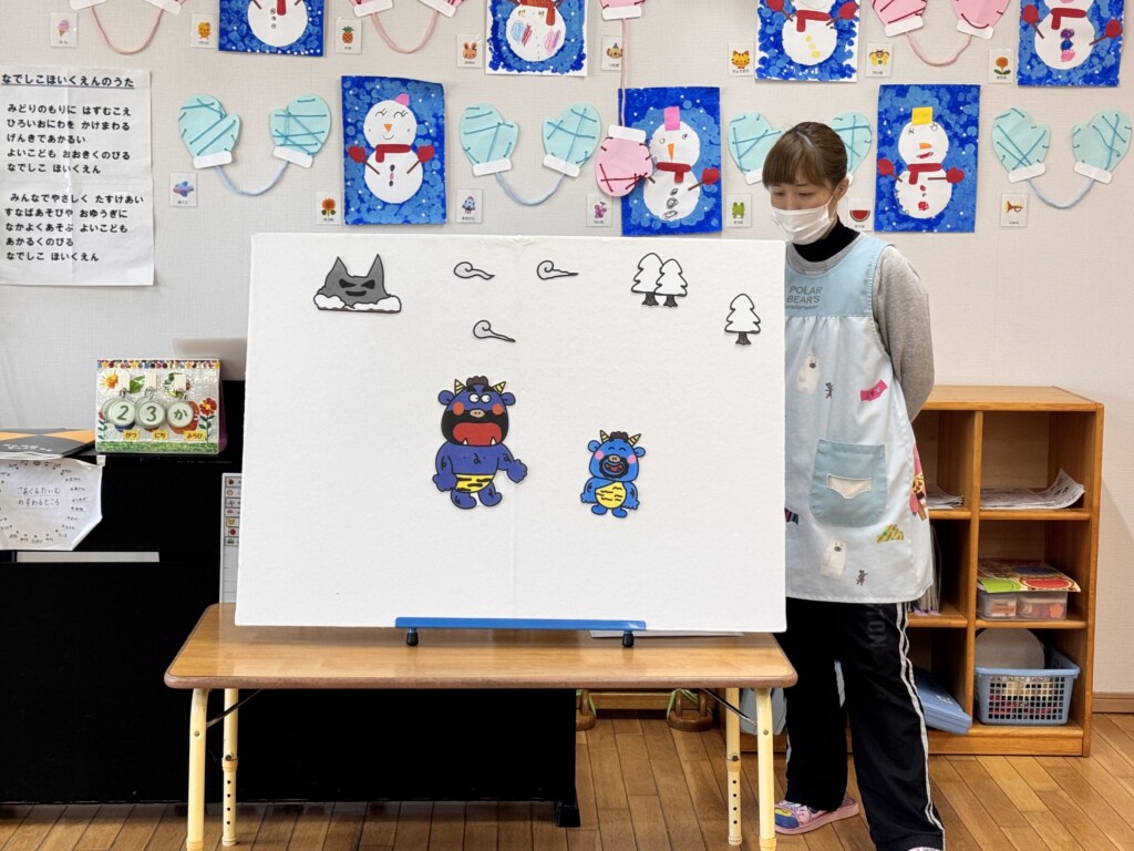 保育者の出し物では、節分の由来についてクイズを交えながら話をすると、知っていることをどんどん発表してくれた子どもたち。